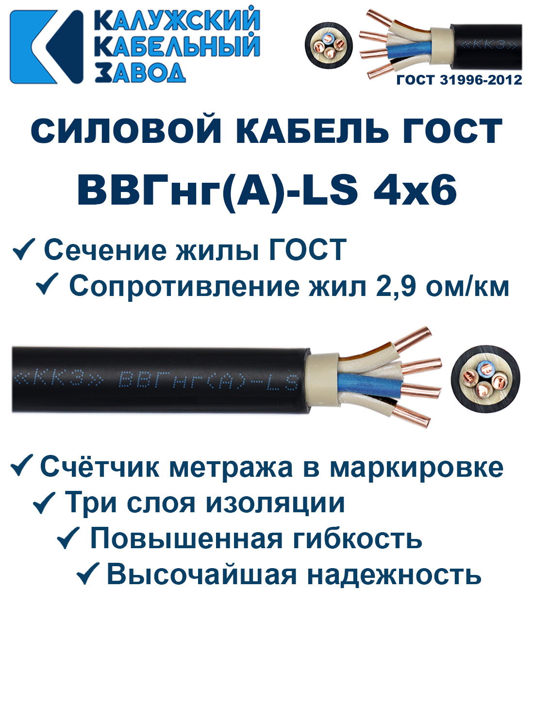 СохранитьКабель силовой ВВГнг(А)-LS 4х6 ГОСТ. 15 метров. Калужский кабельный завод интересное:
