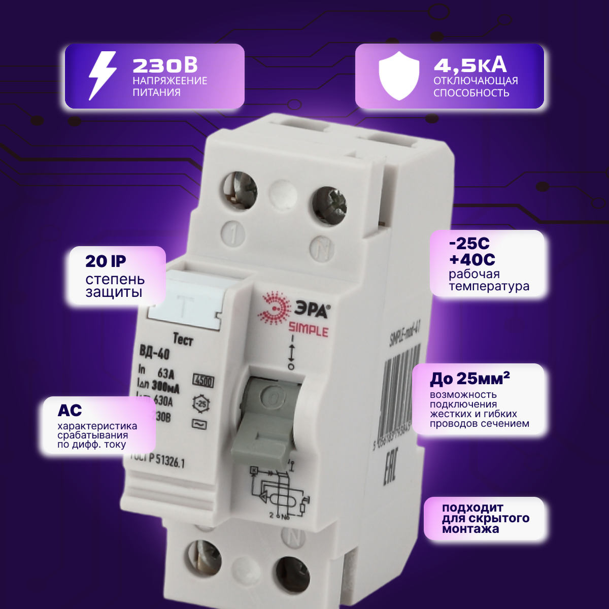 Выключатель диф тока УЗО 2P (2П) 63А 300 мА АС электронное SIMPLE-mod-52 ВД-40 Б0039272 Эра 1шт интересное: