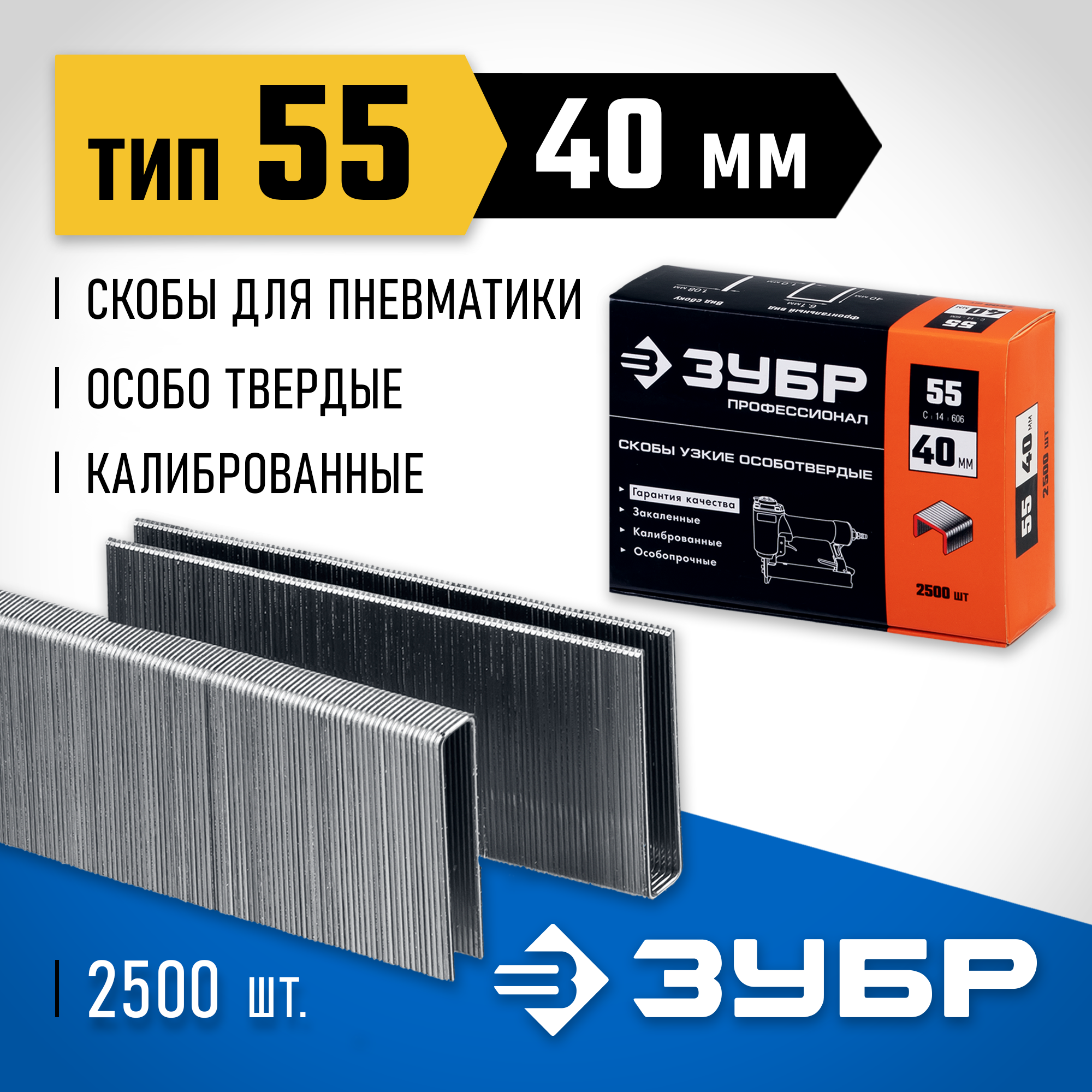 Особотвердые тонкие скобы ЗУБР Профессионал широкие, тип 55, 40 мм, 2500 шт