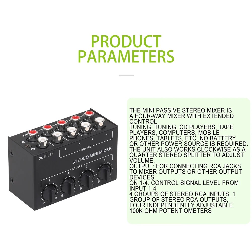 | Особенности | 4-Channel Passive Mixer / Mini passive stereo mixer / Sound Mixer / Stereo audio Mixers / mini stereo four-channel passive mixer |