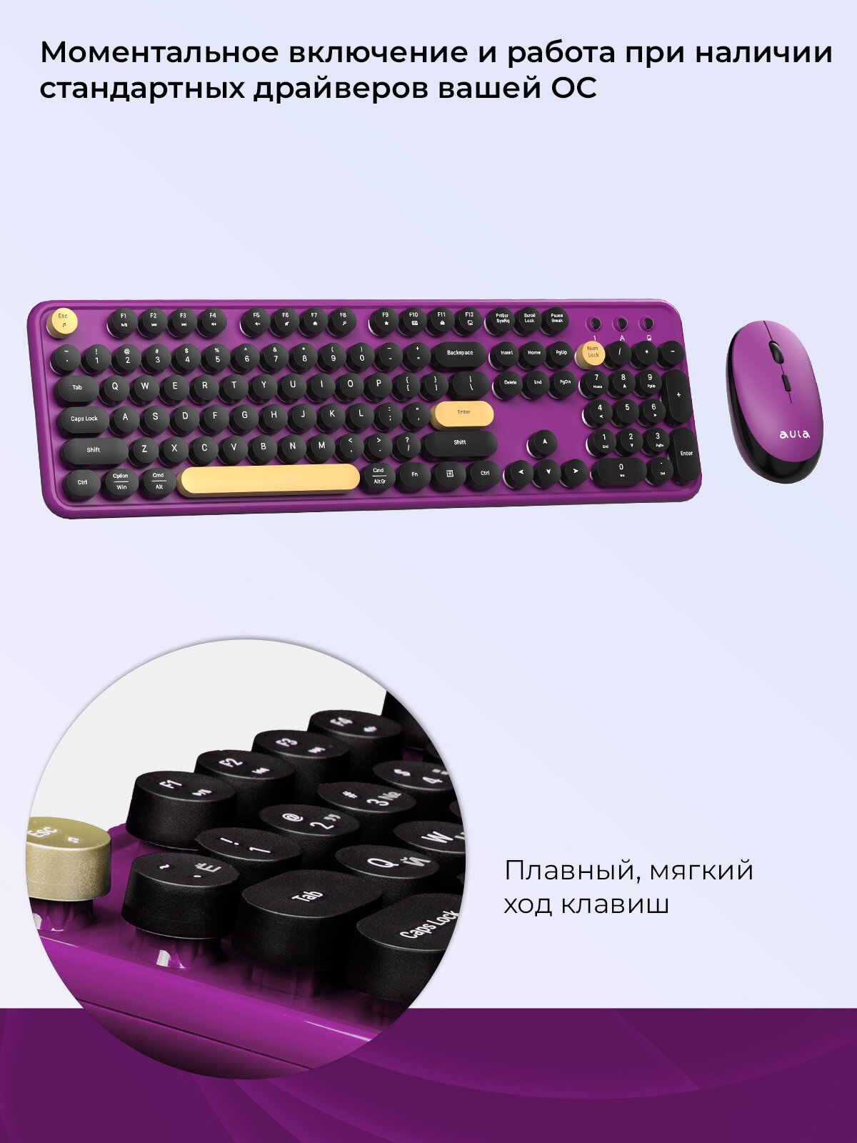 СохранитьКомплект клавиатура + мышь AULA AC306 Purple-Black с беспроводным способом подключения интересное:
