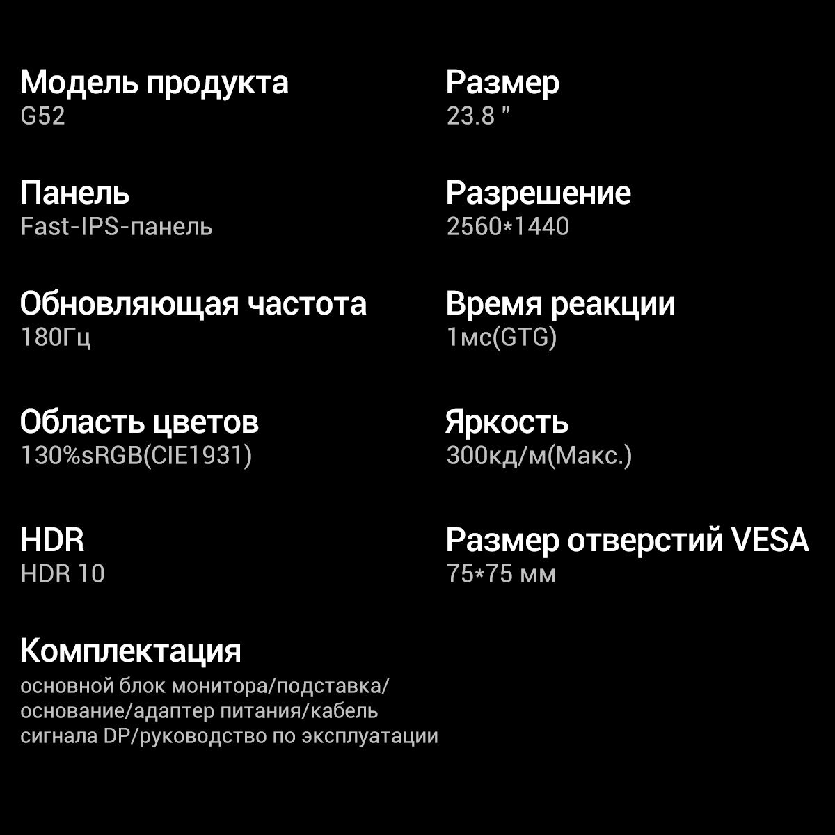 | Подробная комплектация | Монитор Держатель Основание монитора Блок питания Кабель DP Инструкция |
