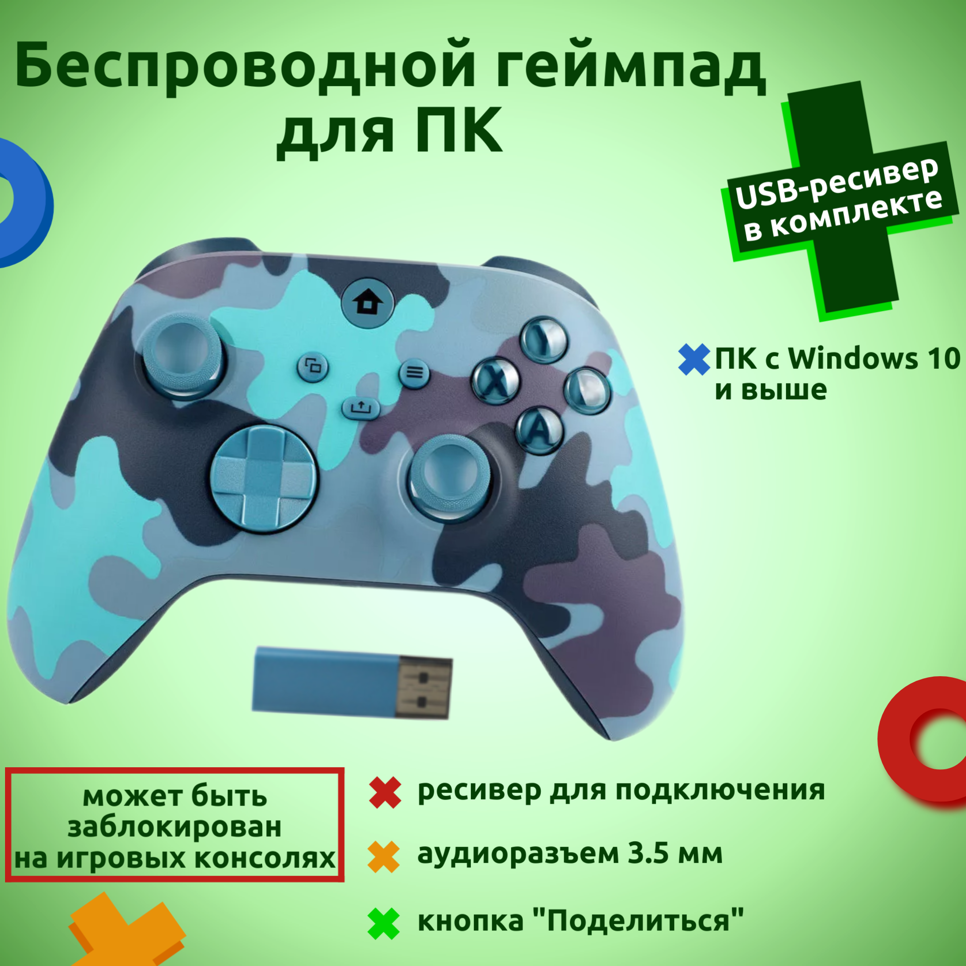 Купить Беспроводной геймпад для ПК с USB-приемником, голубой/черный камуфляж (Mineral Camo)