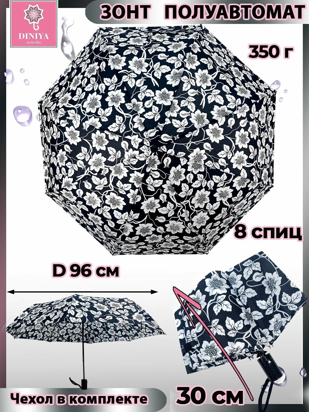Зонт Diniya, черно-белый интересное:
