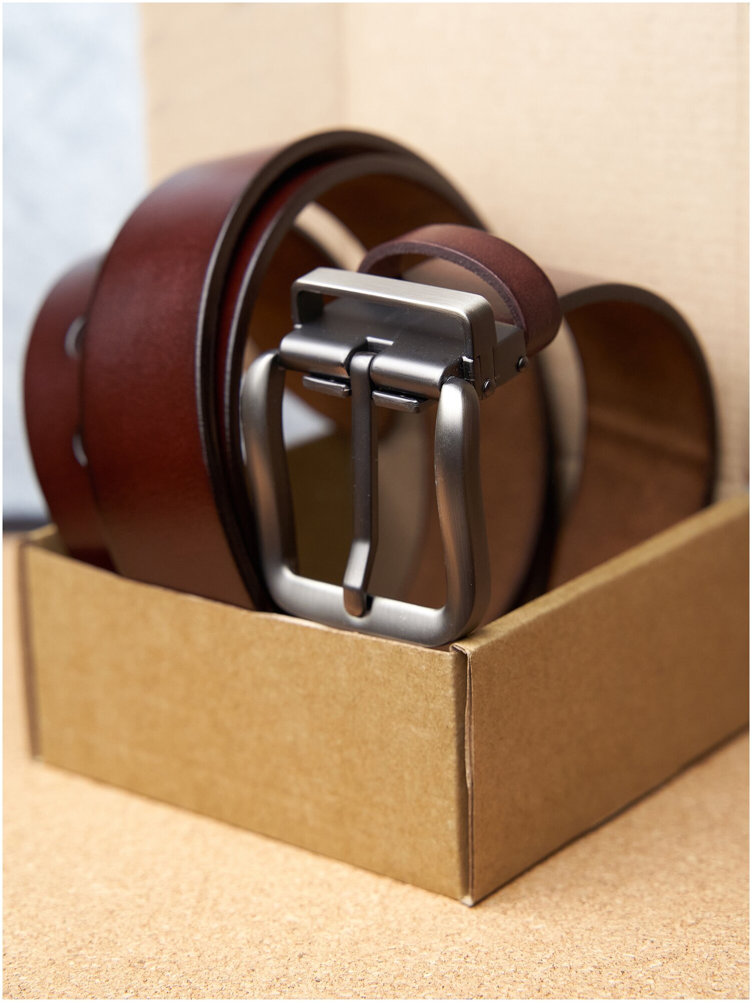 Ремень мужской натуральная кожа широкий для брюк и джинс, 3.8 мм, овальная пряжка, коричневый