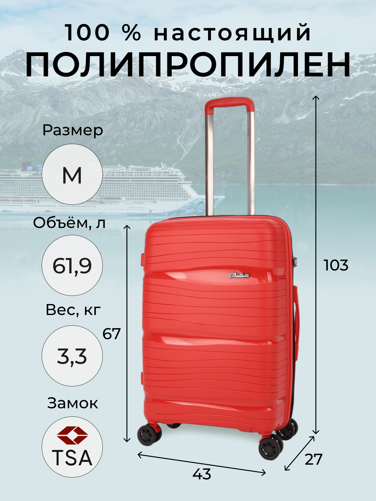 Чемодан Belletti, 61.9 л, размер M, красный/черный интересное: