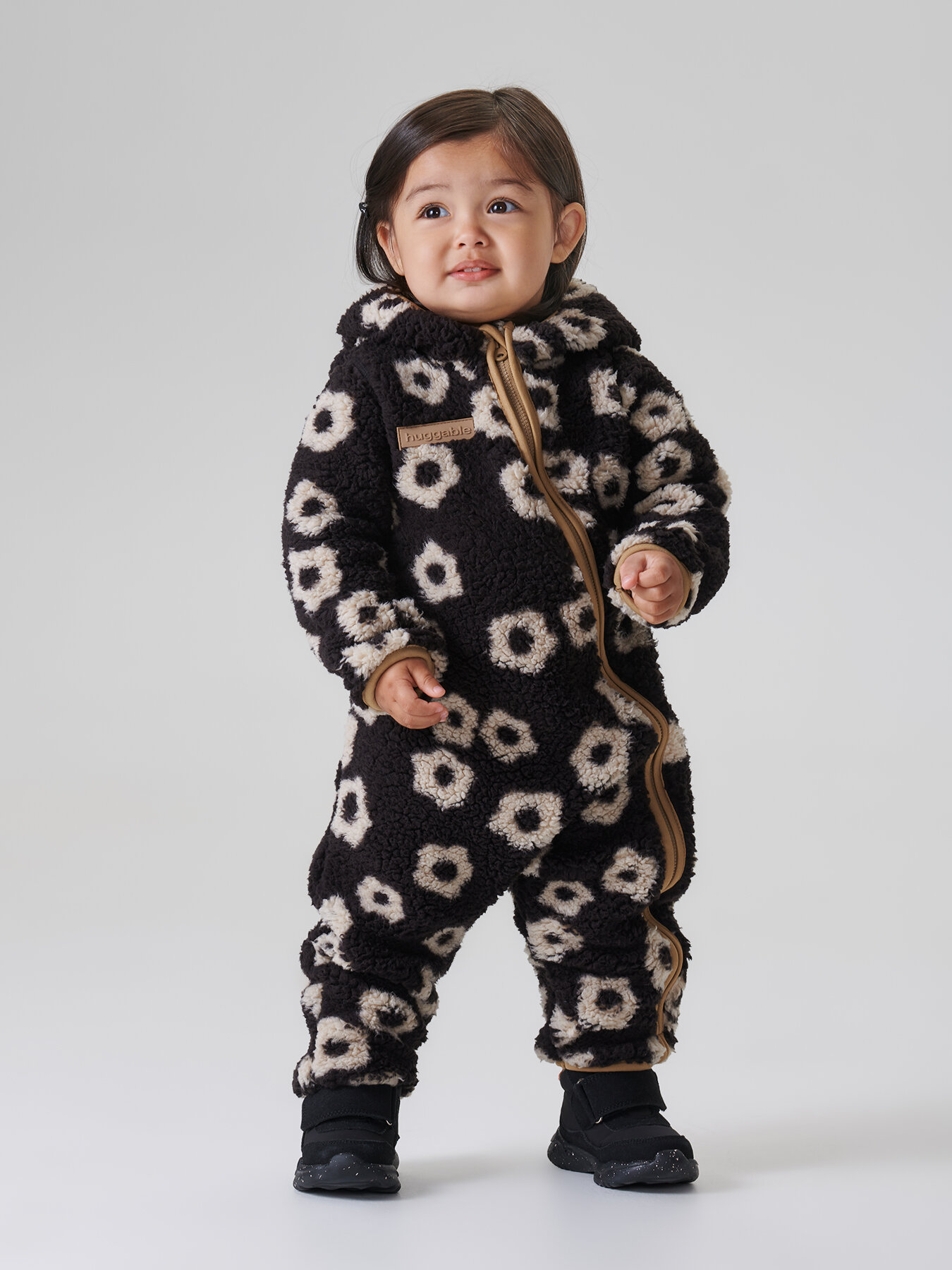 89054, Комбинезон для новорожденных Happy Baby, флисовый, с ушками, демисезонный, черный с цветами, размер 80-86