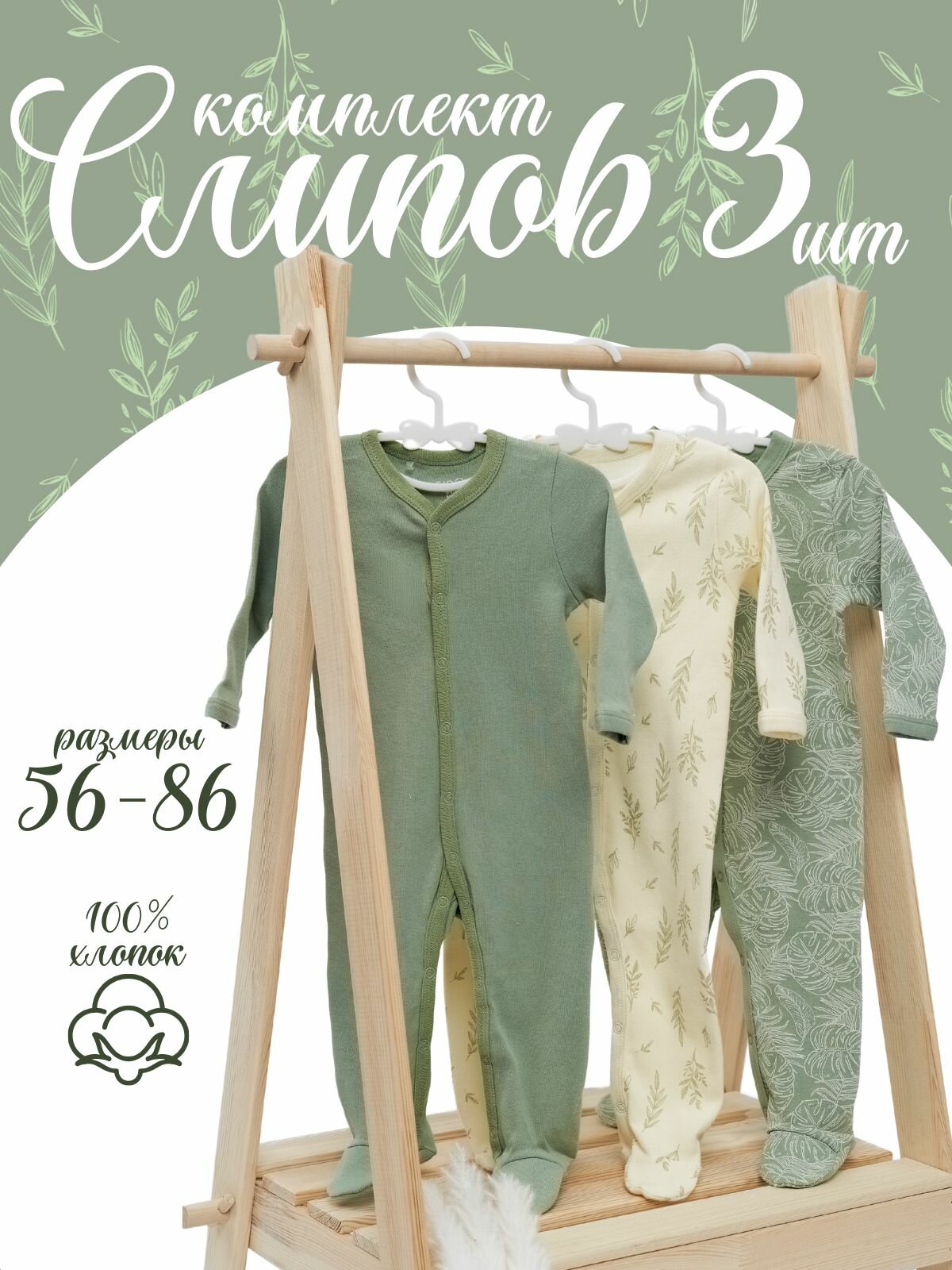 Комплект слип комбинезонов для новорожденных 3 штуки хаки 86