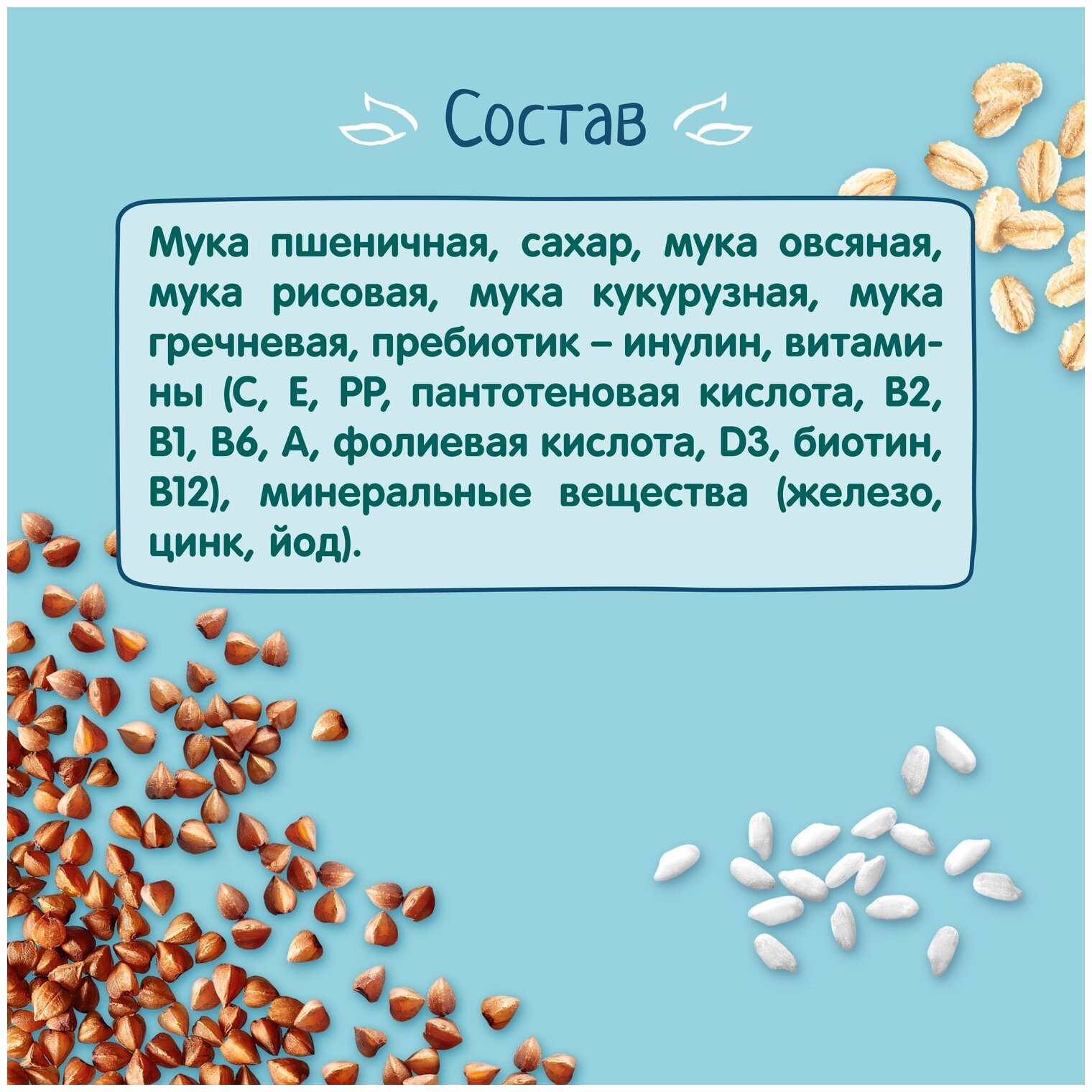 | Состав | мука пшеничная / сахар / мука овсяная / мука рисовая / мука кукурузная / мука гречневая / пребиотик - иннулин / витамины (С / E / PP / пантотеновая кислота / B2 / B1 / B6 / A / фолиевая кислота / D3 / биотин / B12) / минеральные вещества ( железо / цинк / йод) |