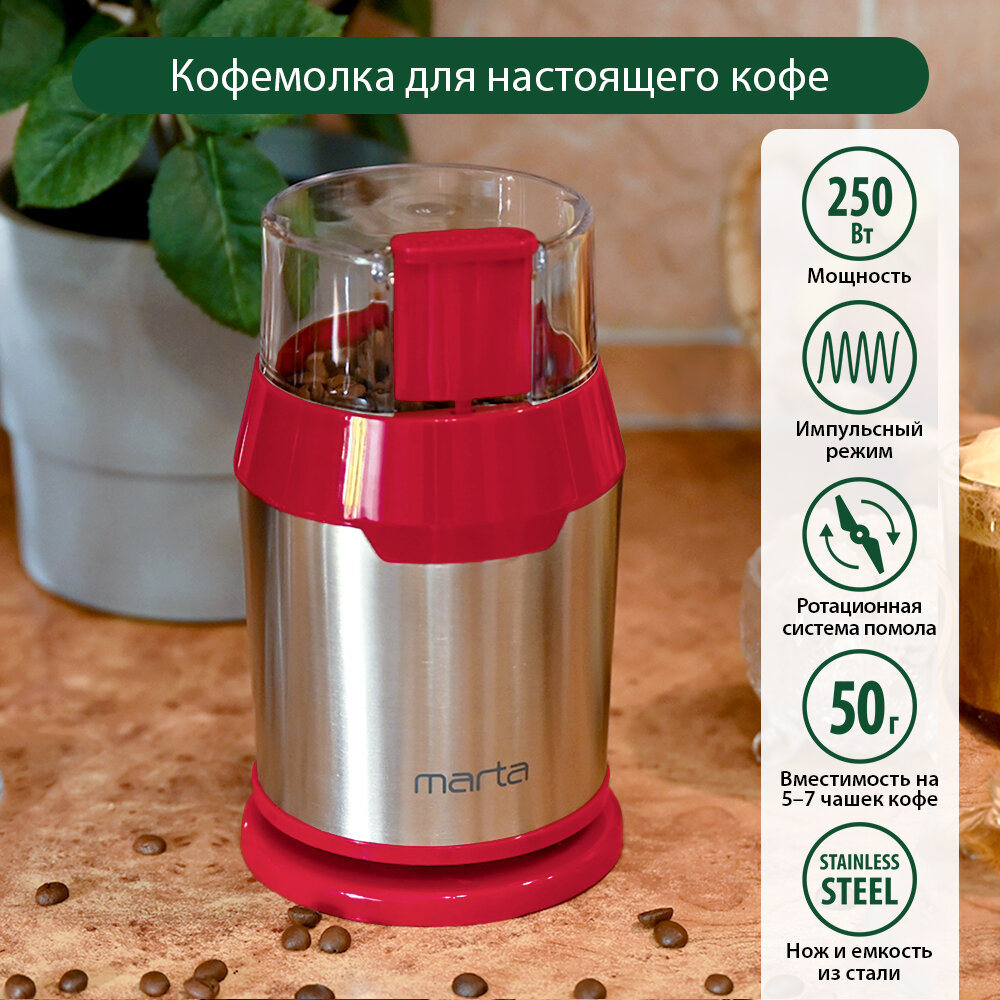 Кофемолка электрическая MARTA, 250ВТ, 50г, цвет яркий коралл