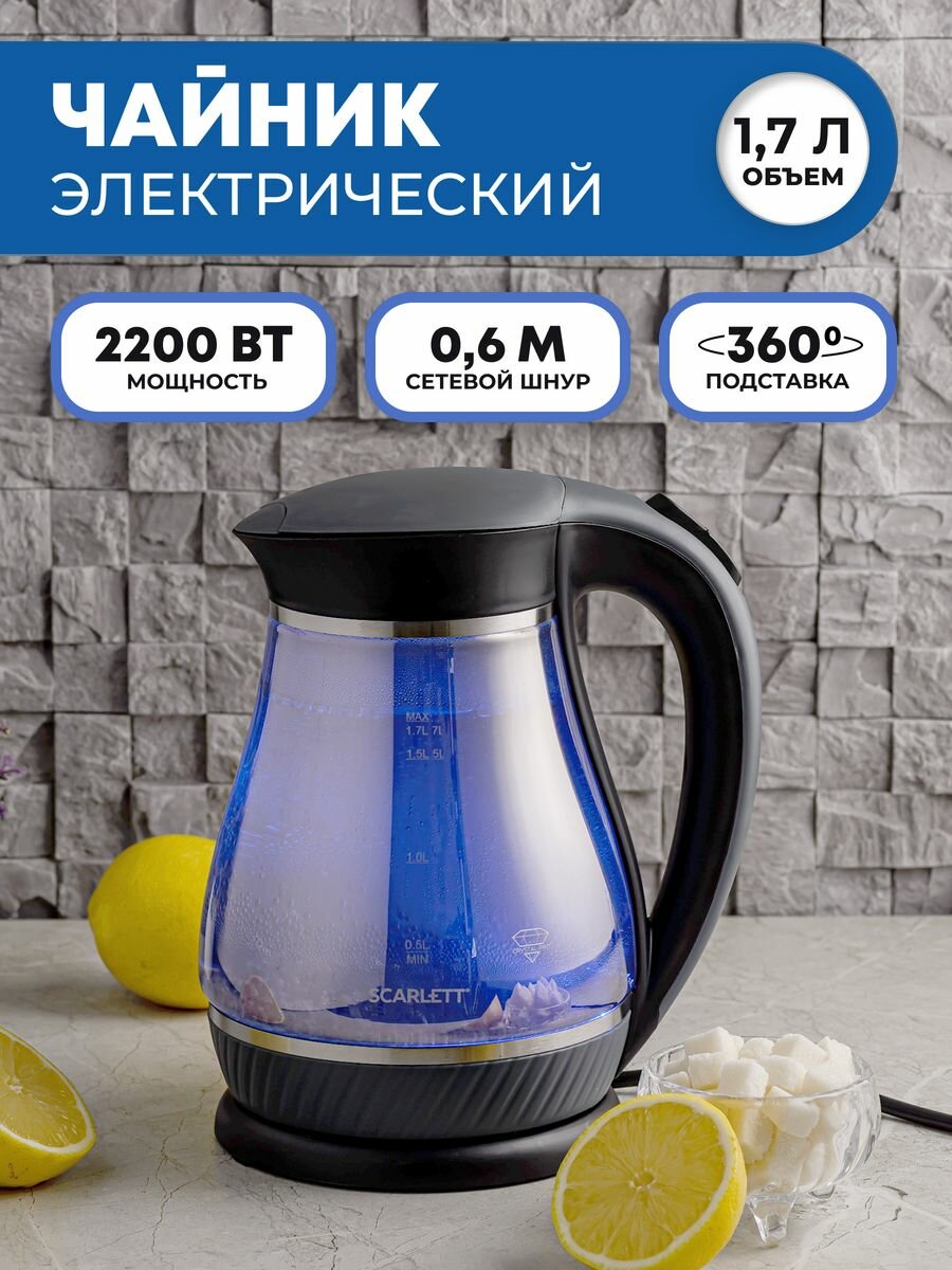 Чайник электрический SCARLETT SC-EK27G82, стекло, 2200Вт, 1.7л, черный