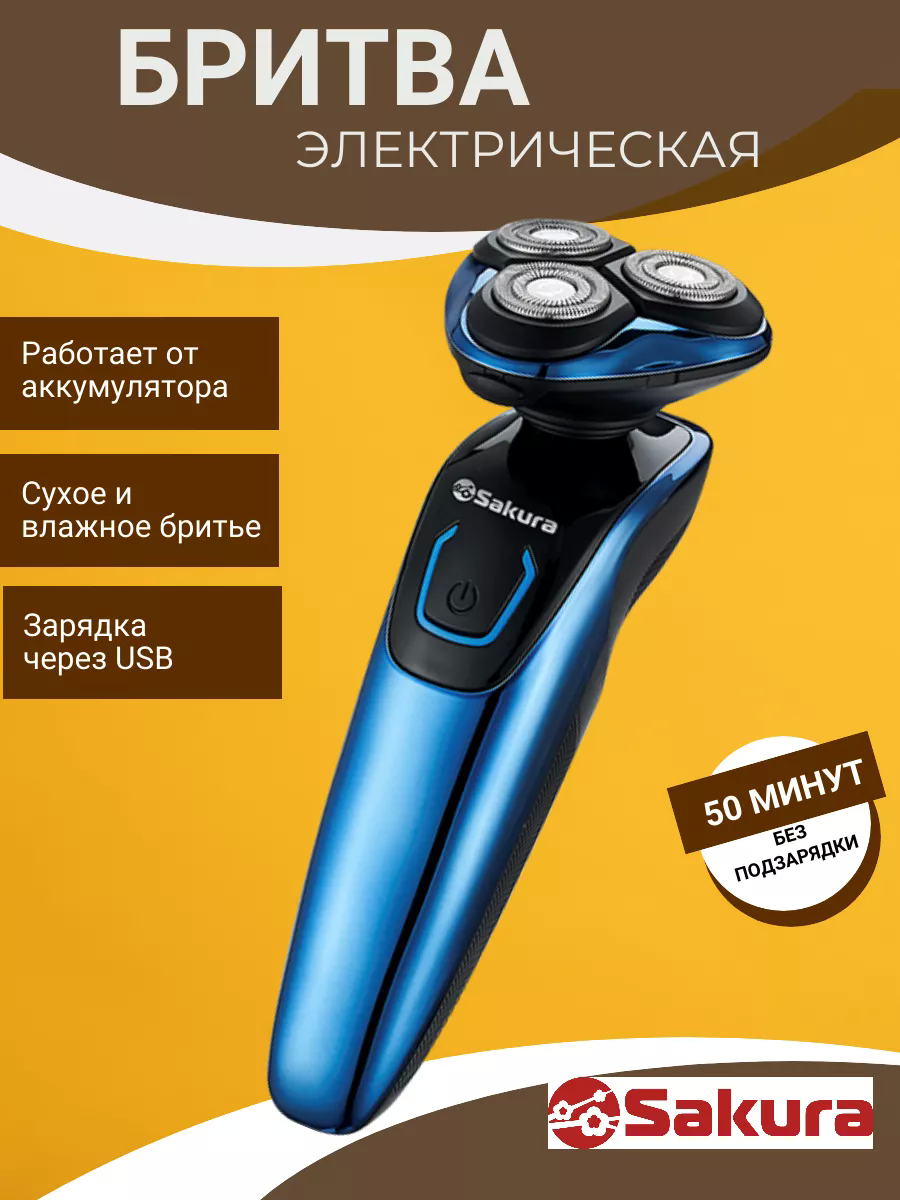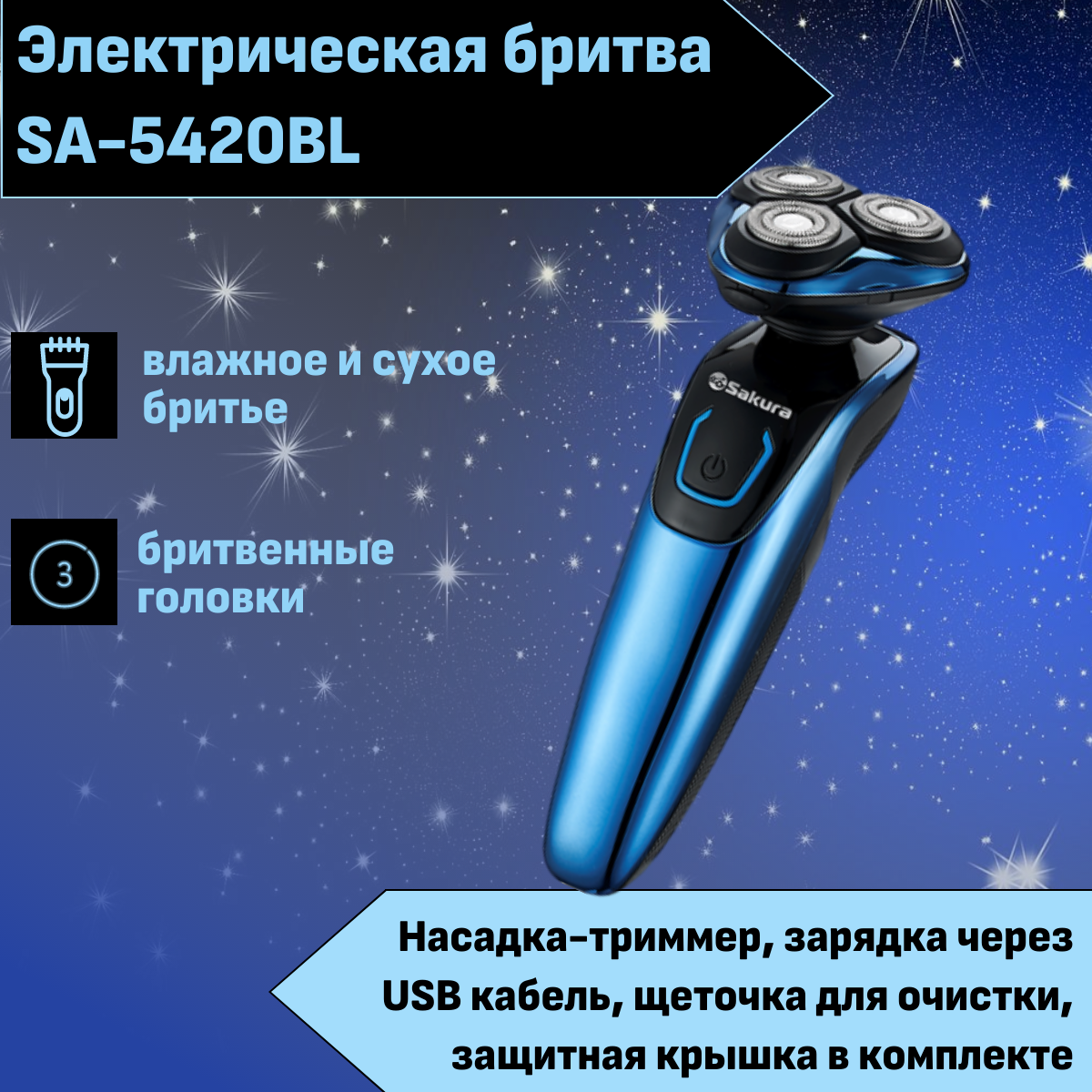 Бритвы SAKURA Электробритва Sakura SA-5420BL, роторная, 3 головки, сухое/влажное бритьё, триммер, АКБ