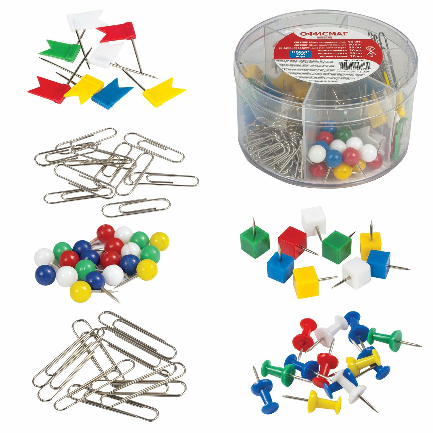 Набор канцелярский Офисмаг (скрепки 28мм, 50мм, гвоздики, шарики, кубики, флажки) 4 уп. (226256)