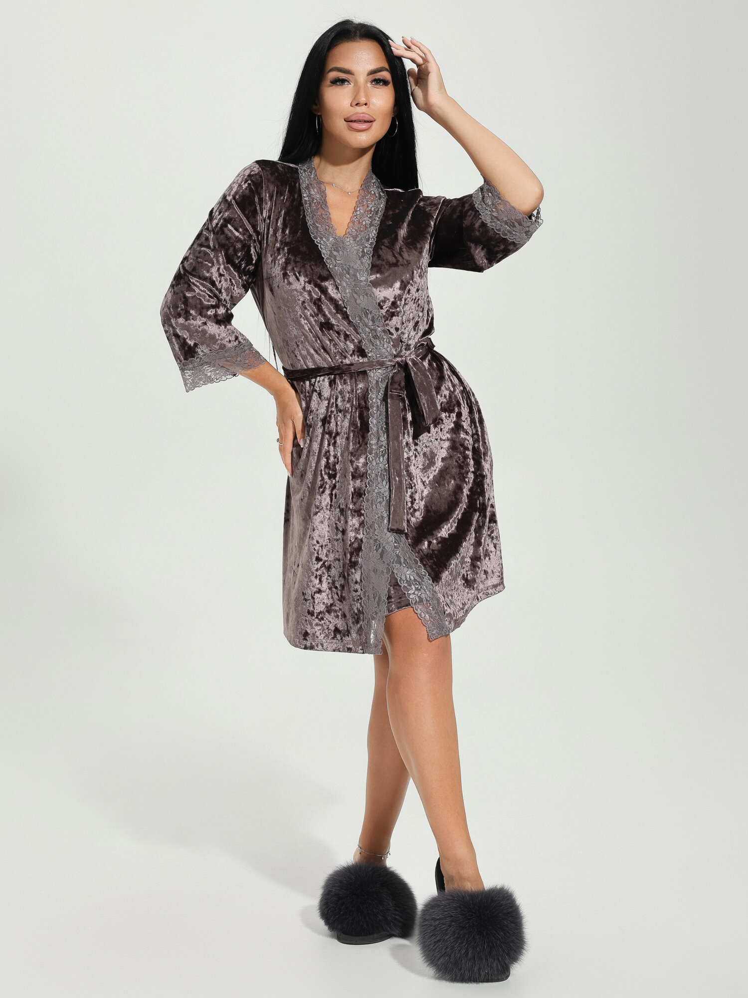 Lovetex.store / Пеньюар кружевной бархатный, халат + сорочка / кофе / размер 44