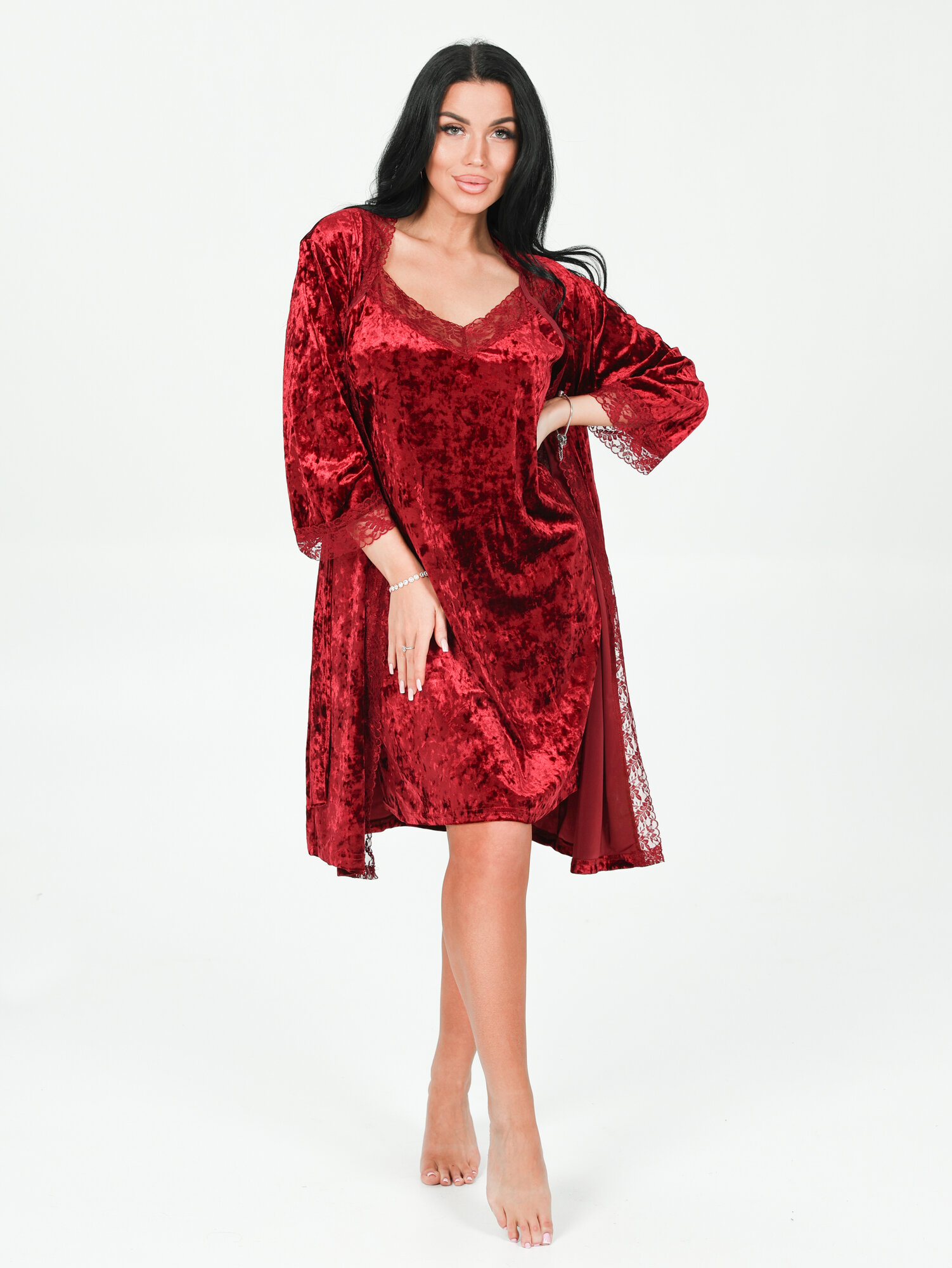Lovetex.store / Пеньюар кружевной бархатный, халат + сорочка / бордо / размер 48