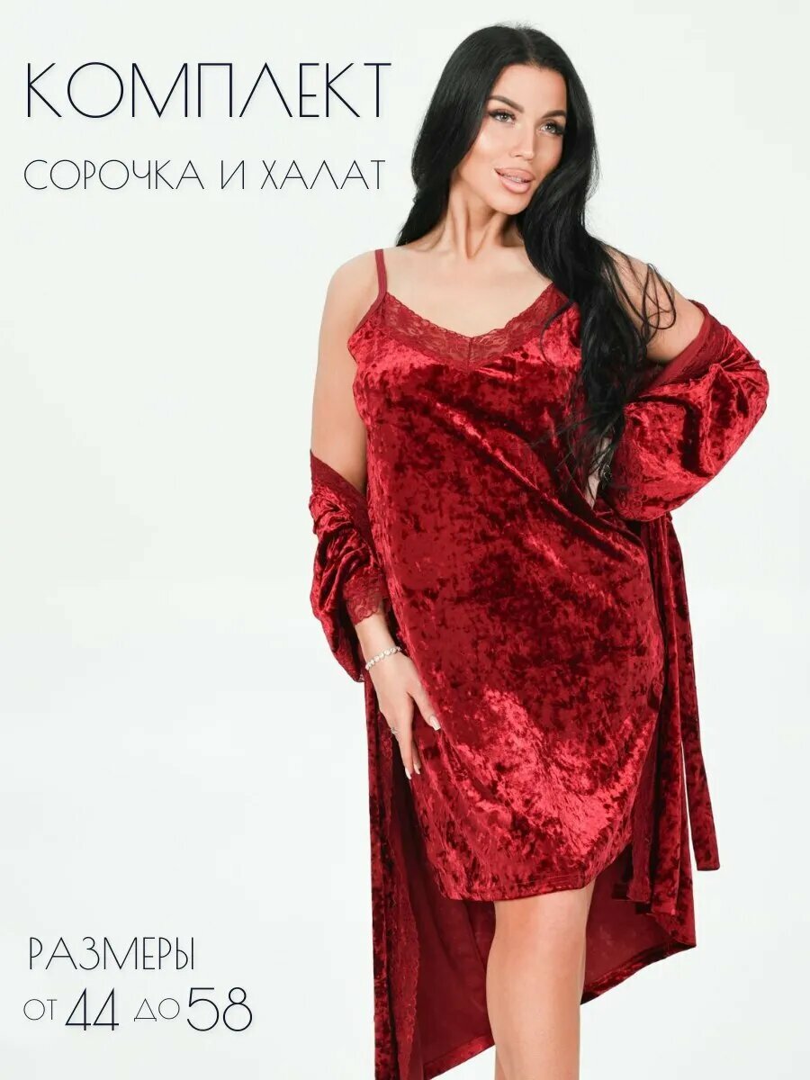 Lovetex.store / Пеньюар кружевной бархатный, халат + сорочка / бордо / размер 56