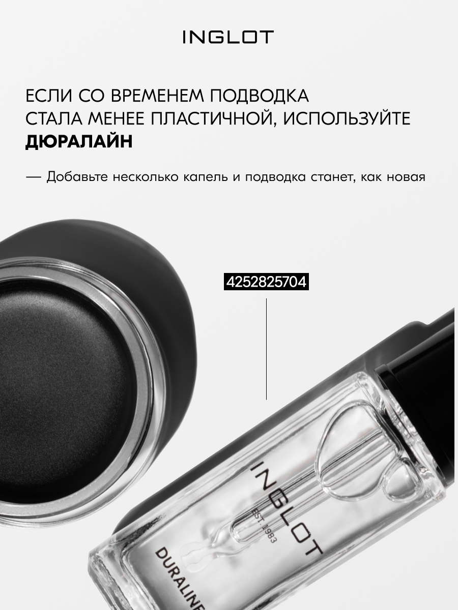 | Способ применения | Наберите небольшое количество подводки для фиксации при контакте с воздухом. Подготовьте веко для нанесения подводки: протрите кожу век мицеллярной водой или средством для снятия макияжа, затем нанесите тонким слоем консилер + пудру/тени или основу для макияжа глаз, чтобы нейтрализовать выработку кожного себума. Дайте подводке высохнуть ~1 минуту, с опущенными вниз глазами, затем можно полностью открывать веки и смотреть наверх. |