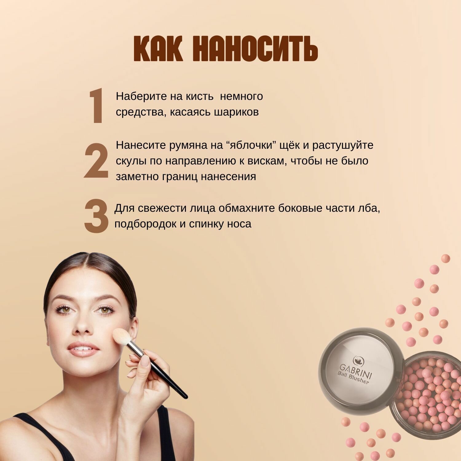 Румяна в шариках Gabrini Ball Blusher, сатиновые,стойкие, тон 301 персиковый, 20,0 г