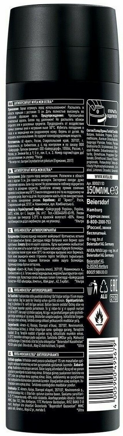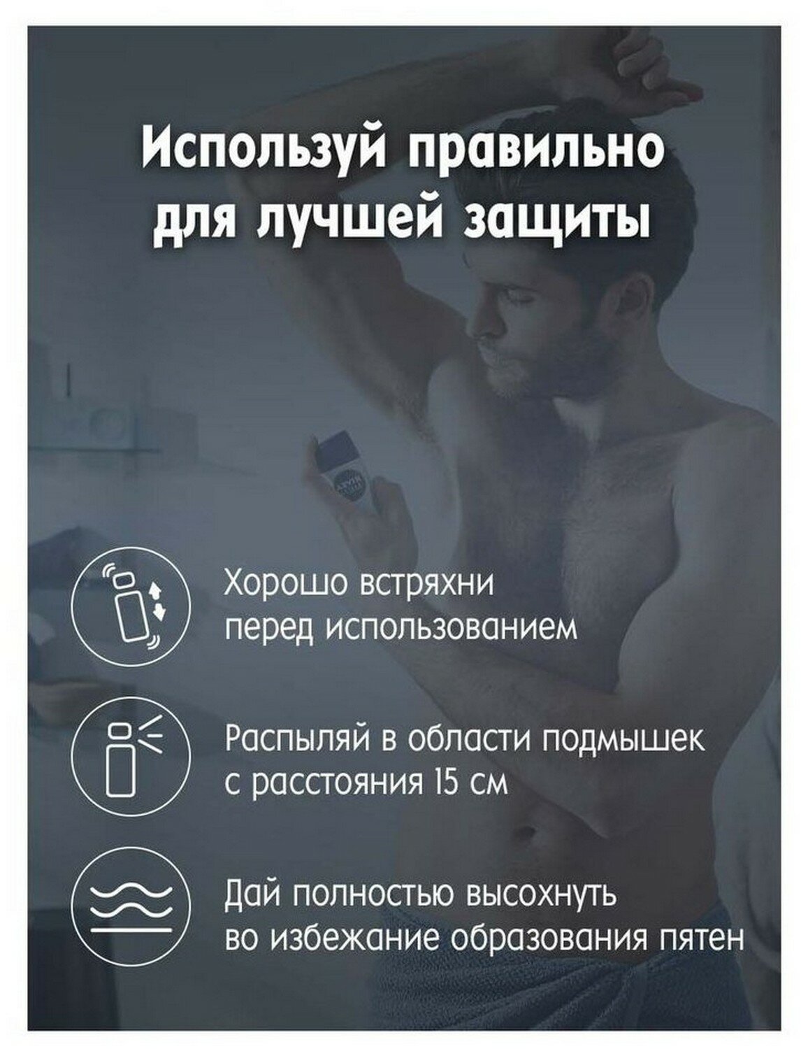 | Дополнительная информация | сильная защита и забота о коже от NIVEA на каждый день! Применение: хорошо встряхнуть перед использованием. Распылять в области подмышек с расстояния 15 см. Дать полностью высохнуть во избежание образования пятен на одежде |