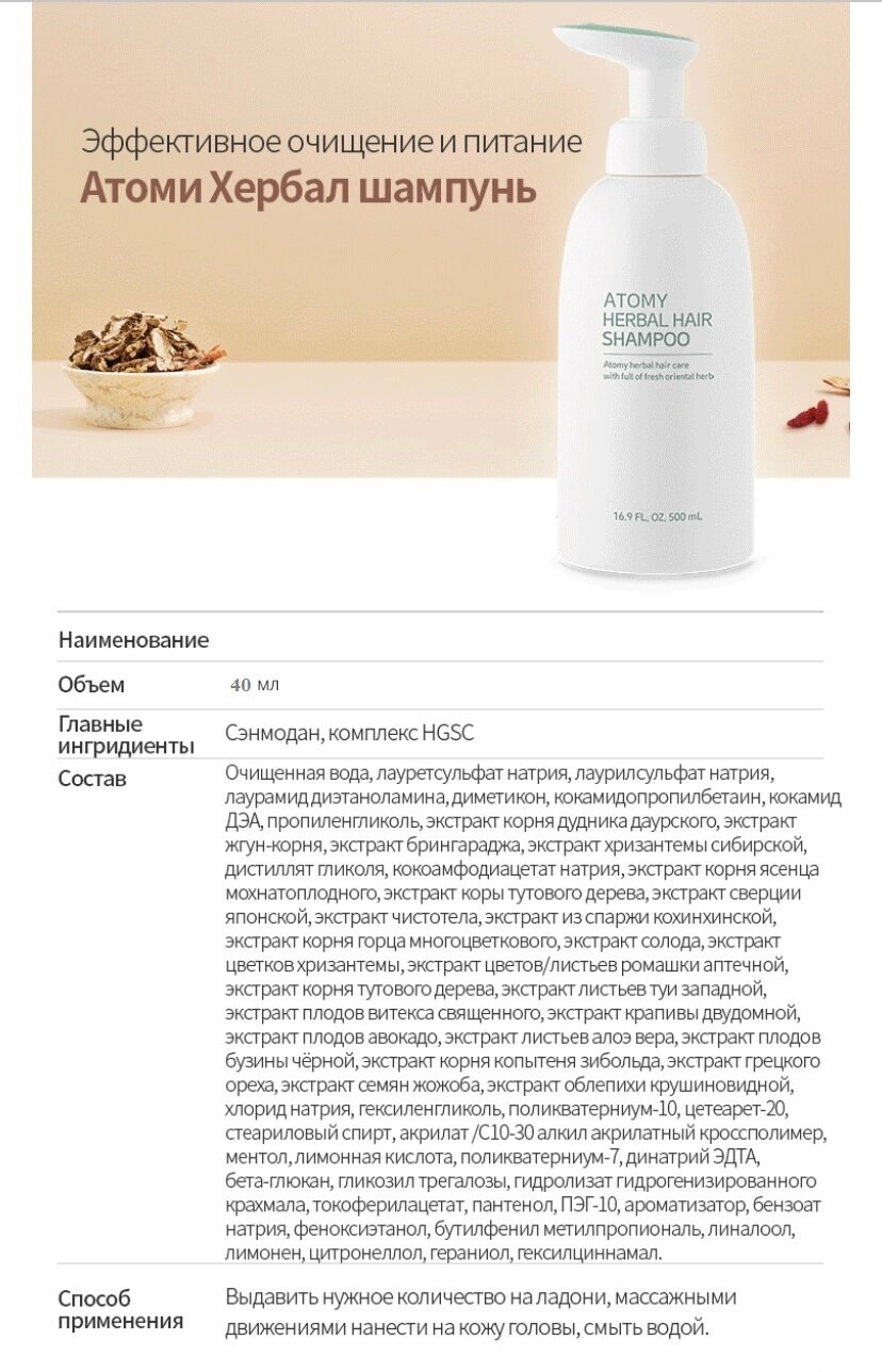 | Состав | Шампунь Atomy Herbal Hair 40 мл. Кондиционер Atomy Herbal Hair 40 мл. Гель для душа Atomy Herbal body 40 мл. Лосьон для тела Atomy Body lotion / 40 мл. Гидрофильное масло Atomy Deep Cleanser 40 мл. Пенка для умывания Atomy Foam Cleanser 40 мл. |