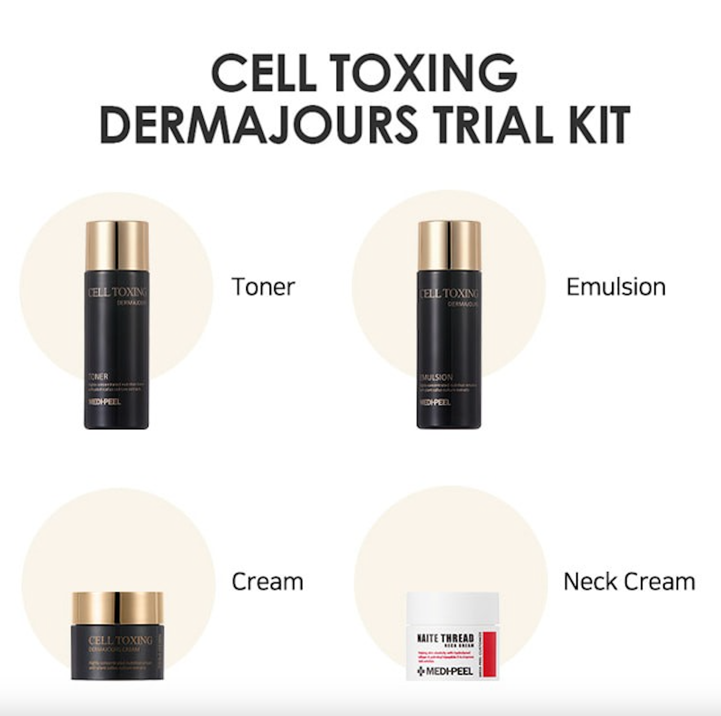 | В наборе | Тонер Medi-Peel Cell Toxing Dermajours Toner — 30 мл Эмульсия Medi-Peel Cell Toxing Dermajours Emulsion — 30 мл Омолаживающий крем Medi-Peel Cell Tox Dermajou Cream — 10 мл Подтягивающий крем для шеи Medi-Peel Naite Thread Neck Cream — 10 мл |