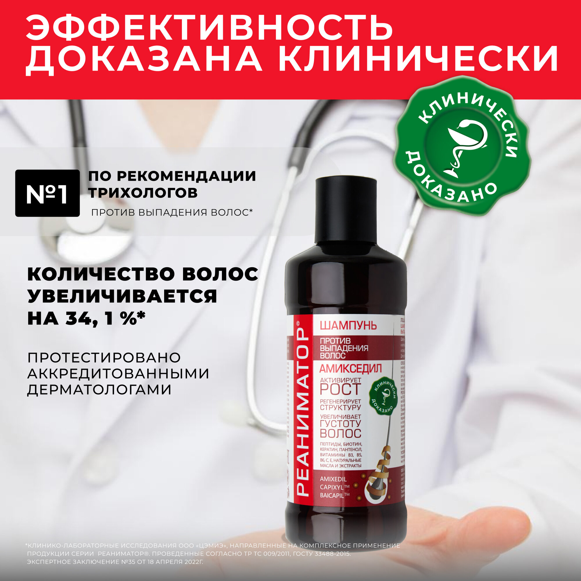 Шампунь для волос женский и мужской РЕАНИМАТОР лечебный, от выпадения волос Лошадиная Сила 7 натуральных экстрактов, 500