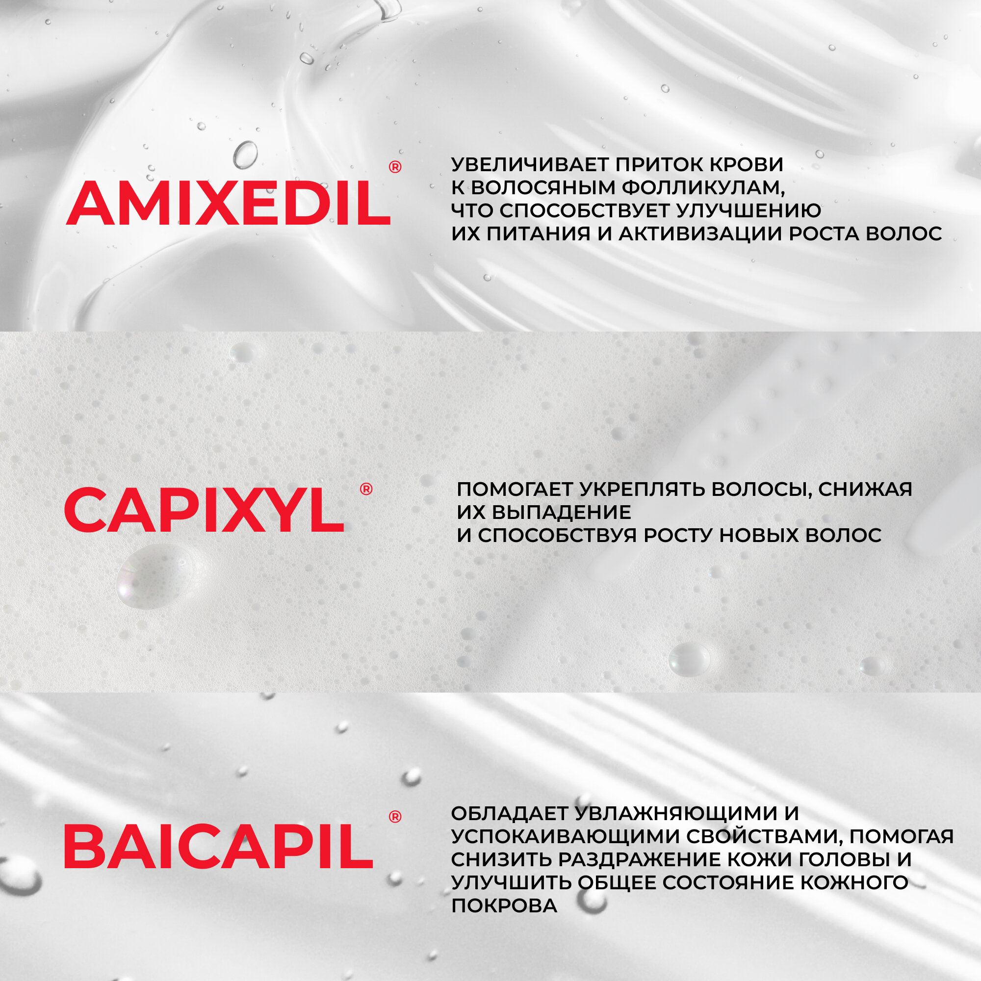 | Активный ингредиент | аргинин / биотин / витамин B5 / витамин B6 / витамин C / витамин E / кератин / кофеин / медь / пантенол / пептиды |