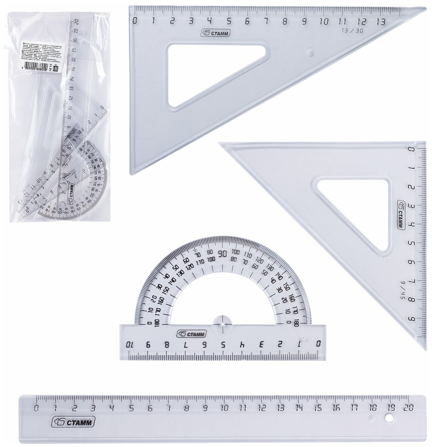 Набор чертежный средний СТАММ, (треуг. 2шт., линейка 20см, транспортир), прозрачный бесцветный ( Артикул 084801 )