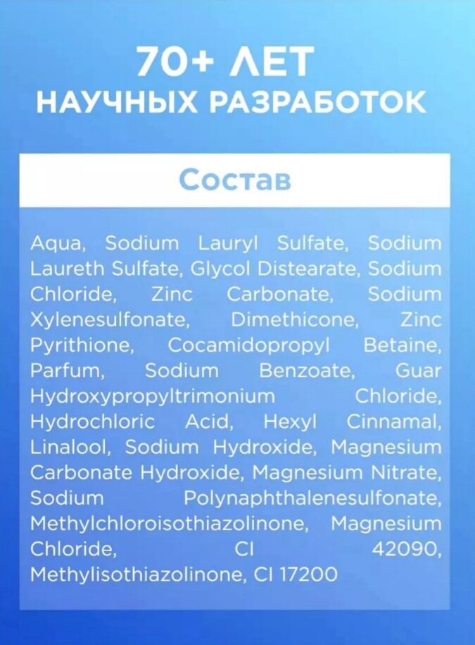 | Состав | aqua, sodium lauryl sulfate, sodium laureth sulfate, glycol distearate, zinc carbonate, sodium chloride, sodium xylenesulfonate, zinc pyrithione, cocamidopropyl betaine, dimethicone, parfum, sodium benzoate, guar hydroxypropyltrimonium chloride, hydrochloric acid, hexyl cinnamal, linalool, sodium hydroxide, magnesium carbonatehydroxide, magnesium nitrate, sodium polynaphthalenesulfonate, methylchloroisothiazolinone, magnesium chloride, ci 42090, methylisothiazolinone, ci 17200 |