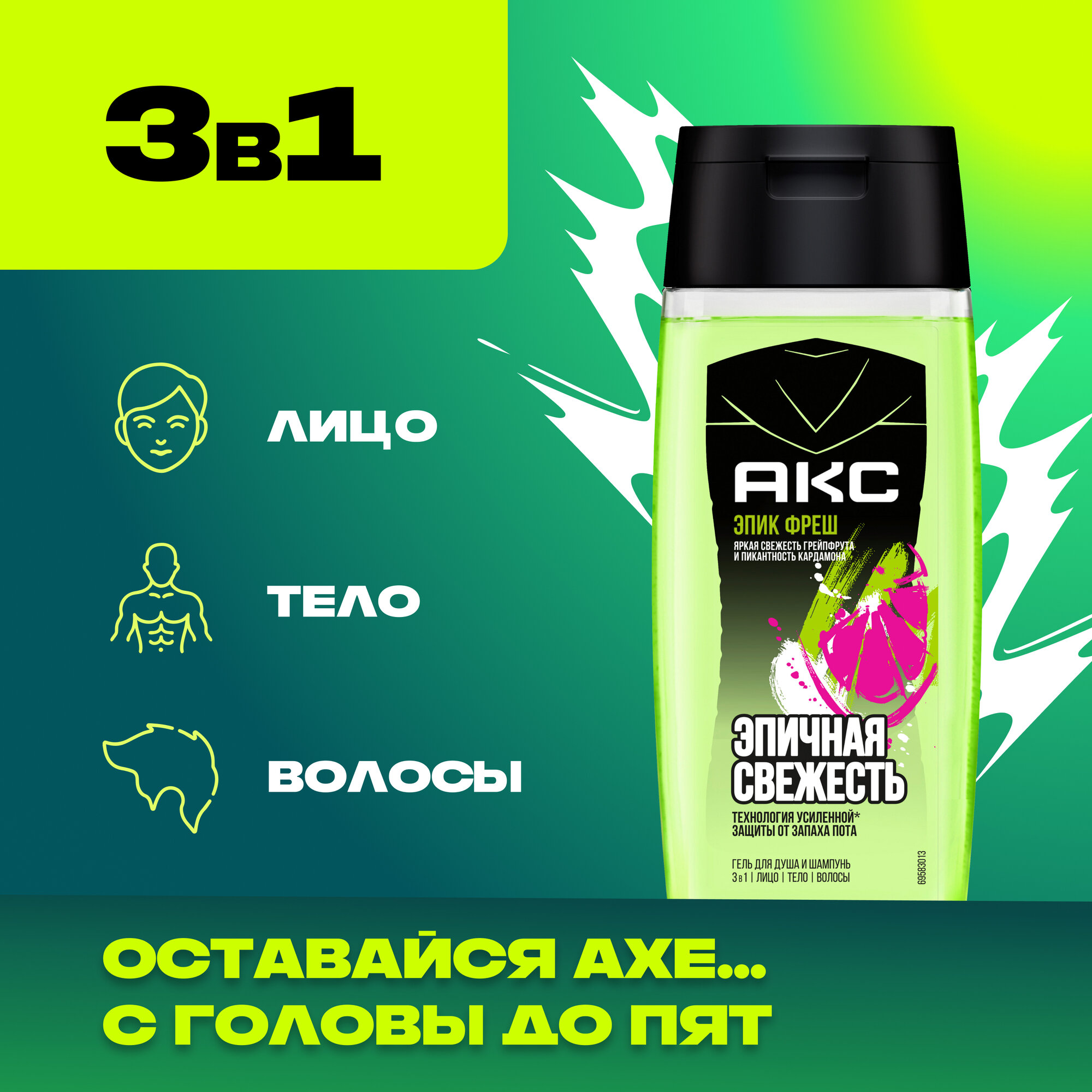 AXE EPIC FRESH гель для душа и шампунь 3 в 1 с пребиотиками и увлажняющими ингредиентами 100 мл