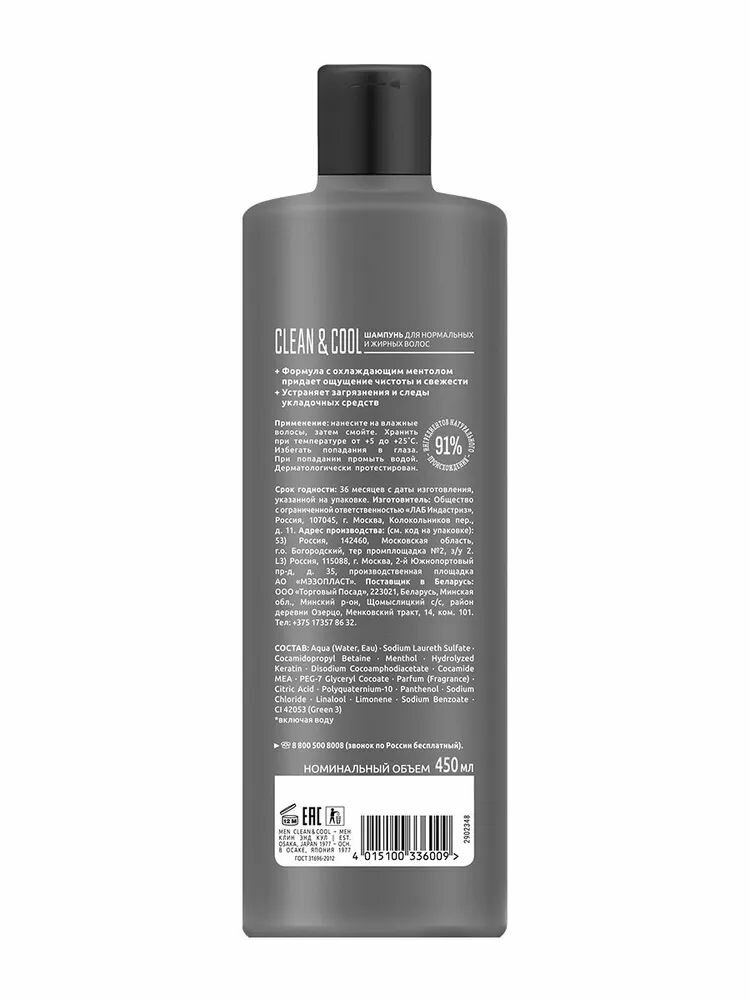 Шампунь для волос СЬĔСС Men "Clean&Cool" мужской, для нормальных и жирных, глубокое очищение, ментол для придания свежести, 450 мл.