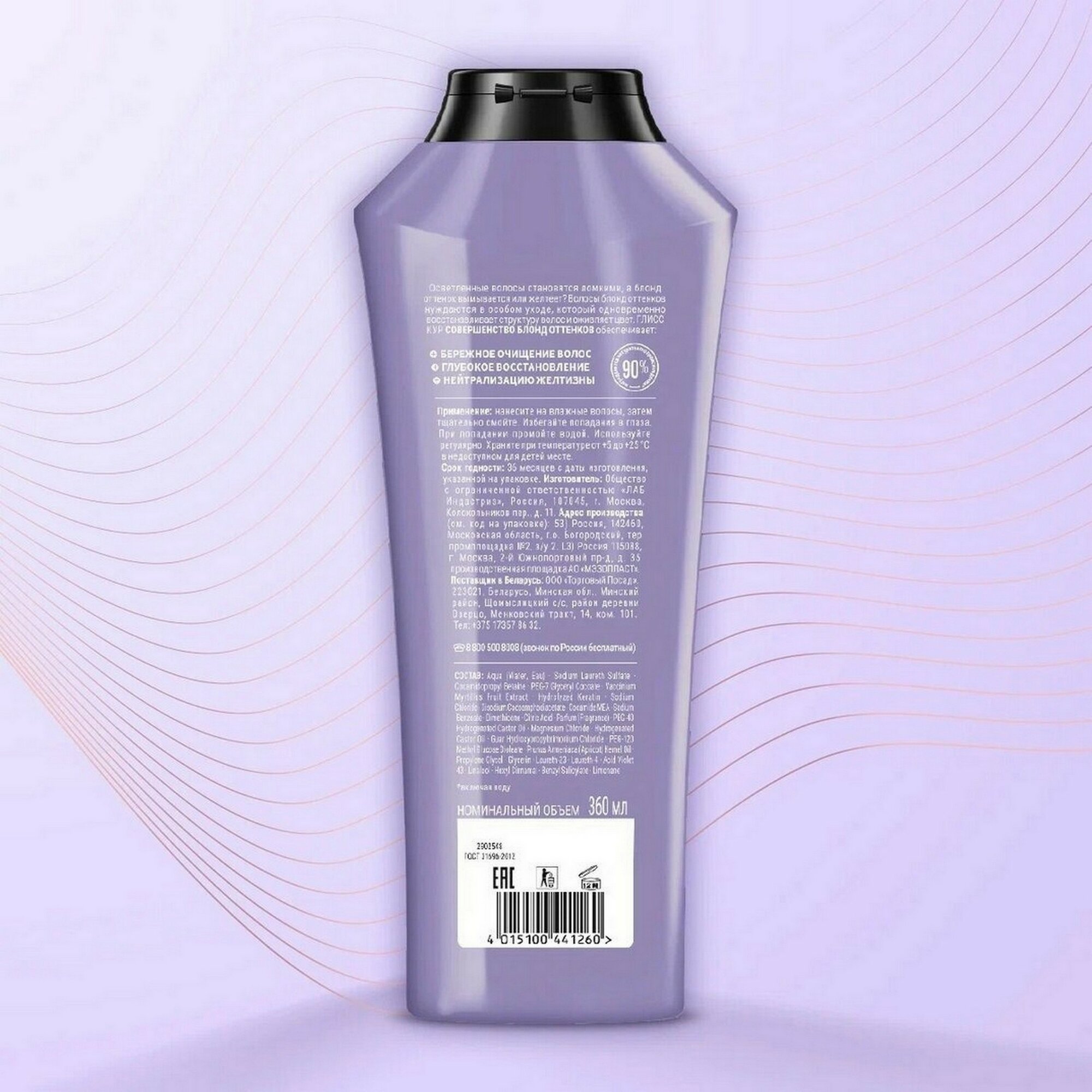| Эффект | восстановление / глубокая очистка / защита цвета / облегчение расчесывания / очищение / придание мягкости / увлажнение / устранение желтизны |