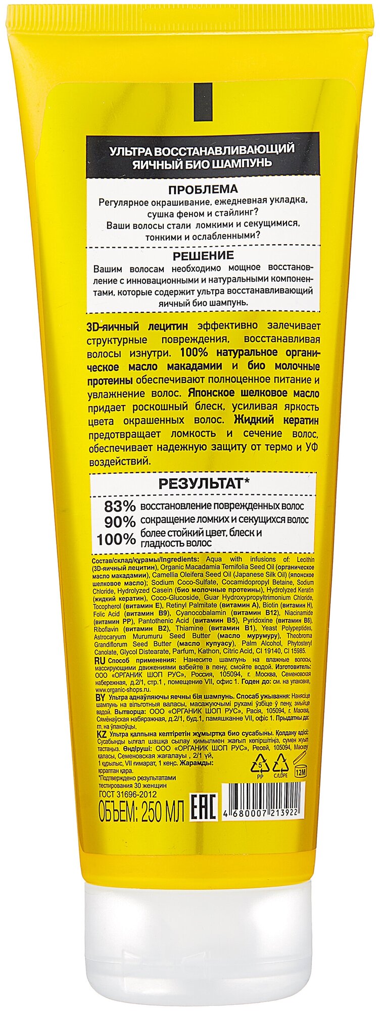 Шампунь Organic Shop "Био-шампунь Egg Organic Naturally Professional", яичный, ультра восстанавливающий, 250 мл интересное: