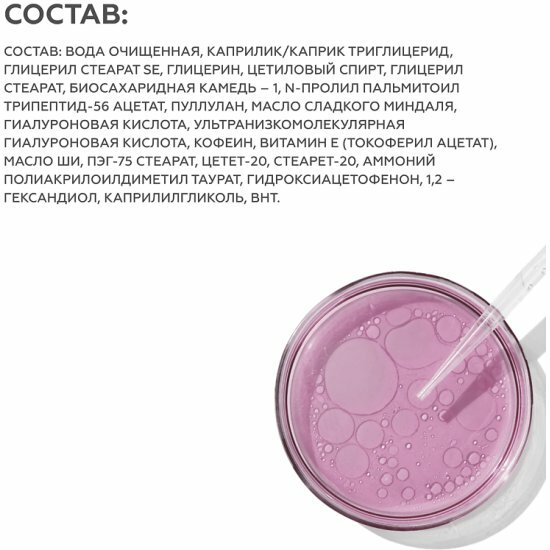 | Состав | вода очищенная, каприлик/каприк триглицерид, глицерил стеарат SE, глицерин, бутиленгликоль, цетиловый спирт, глицерил стеарат, биосахаридная камедь – 1, N-пролил пальмитоил трипептид-56 ацетат, пуллулан, масло сладкого миндаля, гиалуроновая кислота, ультранизкомолекулярная гиалуроновая кислота, кофеин, витамин Е (токоферил ацетат), масло ши, ПЭГ-75 стеарат, цетет-20, стеарет-20, аммоний полиакрилоилдиметил таурат, гидроксиацетофенон, 1,2 – гександиол, каприлилгликоль, БХТ |