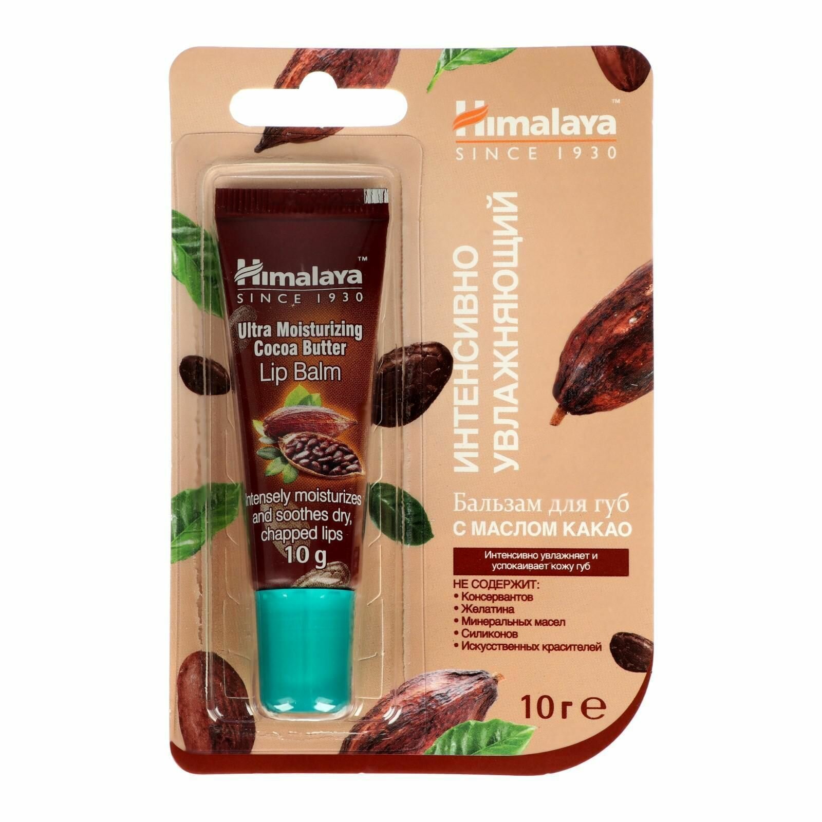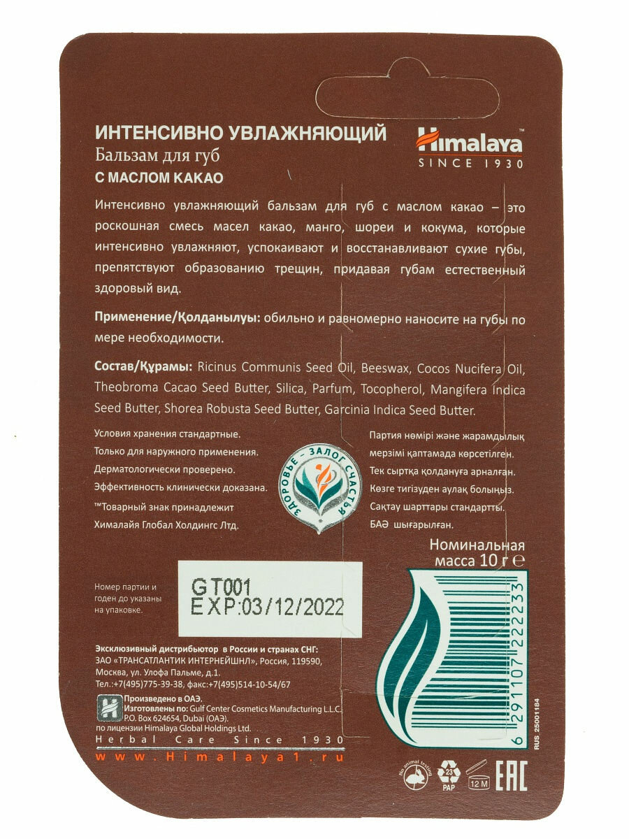 Бальзам для губ интенсивно увлажняющий с маслом какао без парабенов и парафинов, Himalaya (Хималайя), 10г