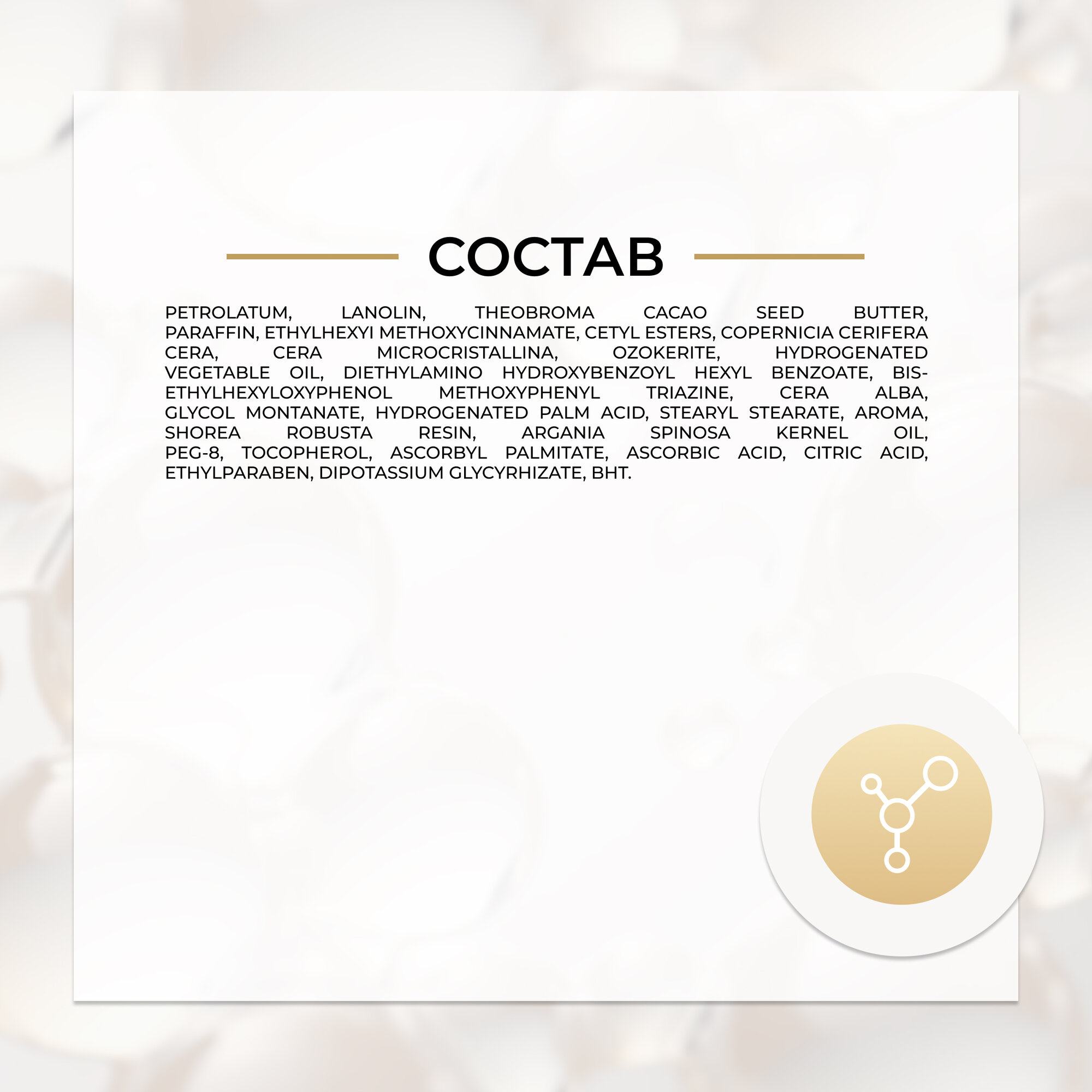 | Состав | Petrolatum, Lanolin, Theobroma Cacao Seed Butter, Paraffin, Ethylhexyl Methoxycinnamate, Cetyl Esters, Copernicia Cerifera Cera, Cera Microcristallina, Ozokerite, Hydrogenated Vegetable Oil, Diethylamino Hydroxybenzoyl Hexyl Benzoate, Bis-Ethylhexyloxyphenol Methoxyphenyl Triazine, Cera Alba,Glycol Montanate, Hydrogenated Palm Acid, Stearyl Stearate, Aroma, Shorea Robusta Resin, Argania Spinosa Kernel Oil, PEG-8, Tocopherol, Ascorbyl Palmitate, Ascorbic Acid, Citric Acid, Ethylparaben, Dipotassium Glycyrrhizate, Limonene, Benzyl, Alcohol, BHT. |