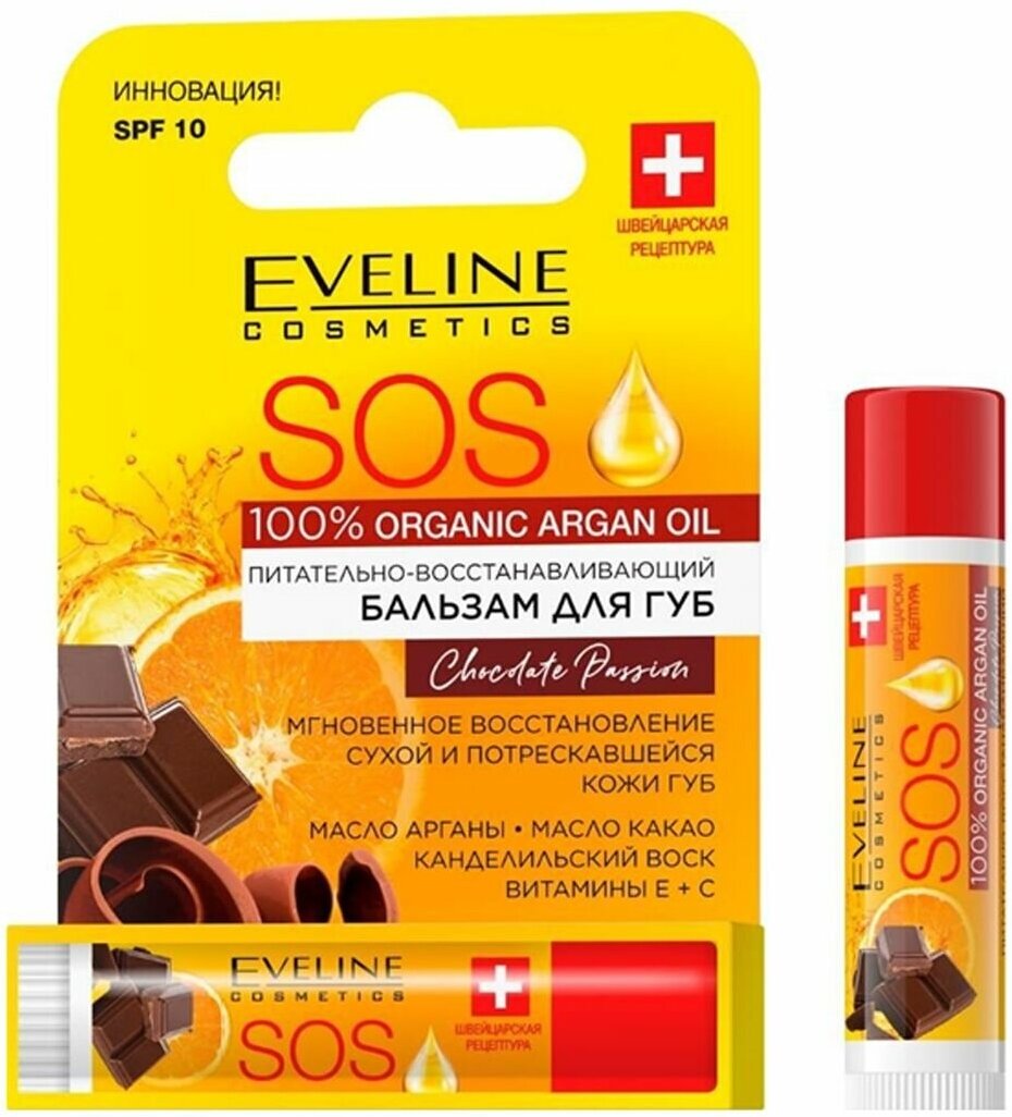 EVELINE Бальзам для губ SOS ARGAN OIL CHOCOLATE PASSION восстанавливающий, 4,5 г