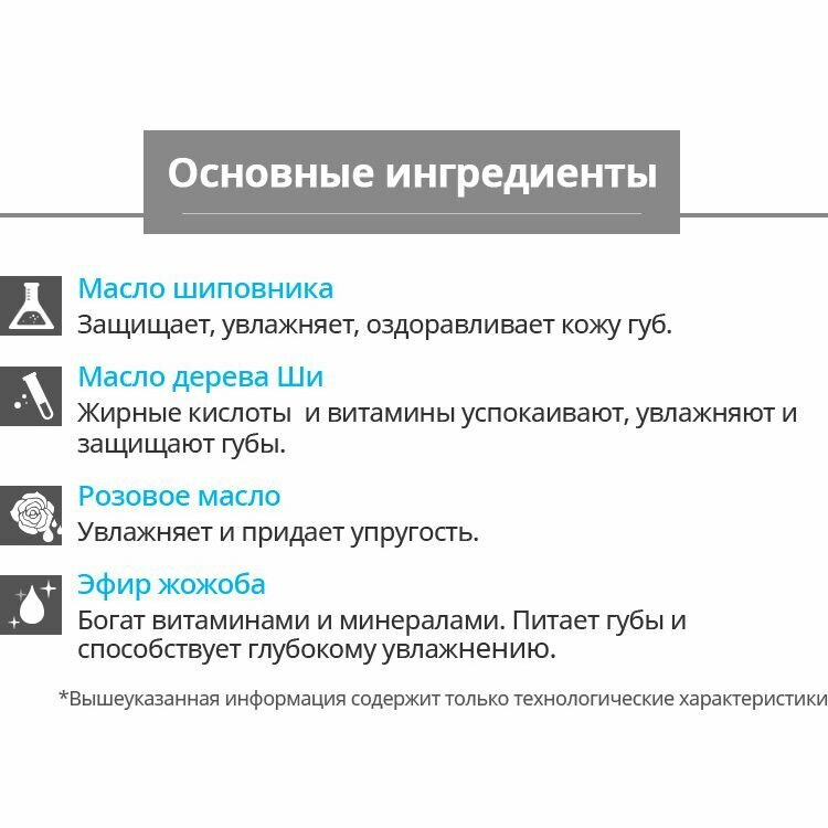 | Состав | розовое масло, масло шиповника, масло дерева Ши, гидрированный полиизобуген, диизостеарилмалат, димер дилинолета фитостерила/изостеарила/цетила/стеарила/ бегенила, пентаэритритил тетраизостеарат, дифенил диметикон, этилгексилметоксициннамат, эфир жожоба, микрокристаллический воск, каприлил метикон, дипентаеритритил, гексагидроксистеората/гексастерата/гексаросината, триоктилдодециловый цитрат, октил салицилат, октилдодеканол, глицерил бегенат/эикосадионат, церезин, феноксиэтанол, каприлилгликоль, ароматизатор, глицерил каприлат, красный краситель 27, оксид титана, ионол, красный краситель 6, красный краситель 7, масло авокадо, масло дамасской розы |