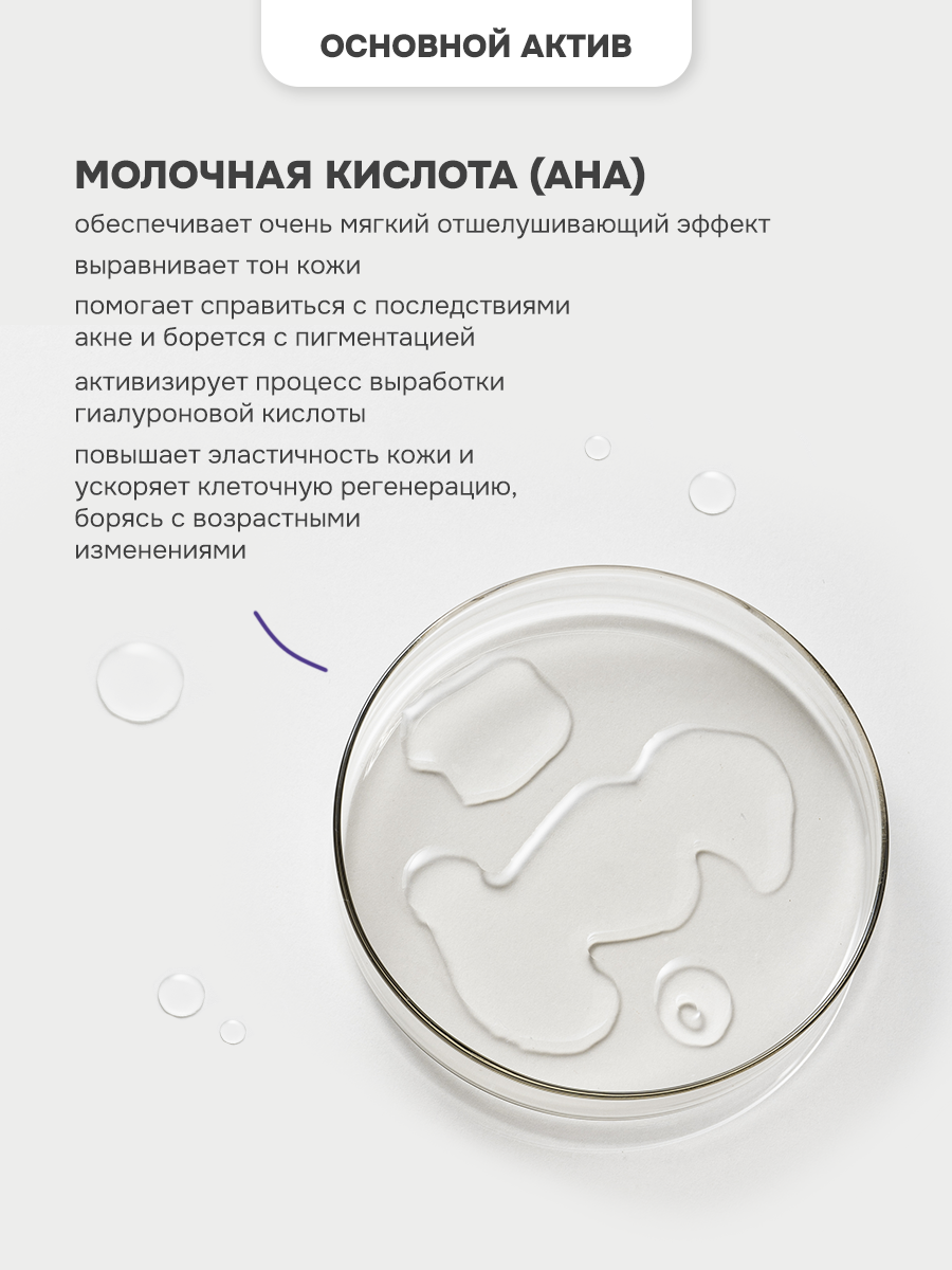 | Активный ингредиент | AHA-кислоты / витамин E / гиалуроновая кислота / глицерин / молочная кислота / сквален / сорбитол / спирт |
