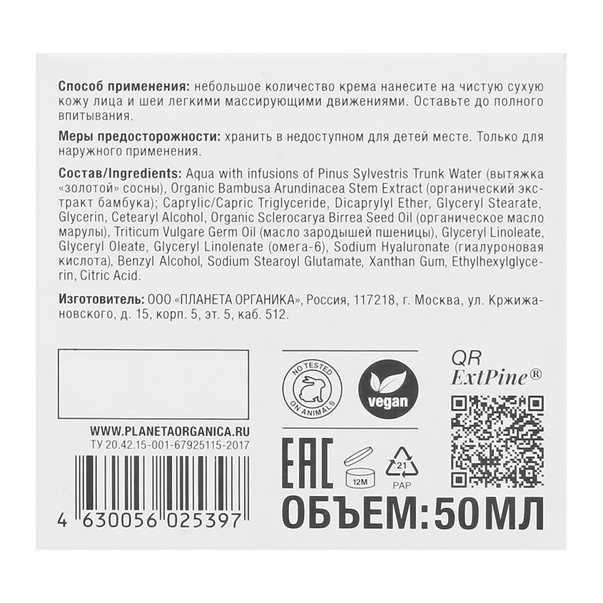 Дневной крем для лица Planeta Organica Pure гипоаллергенный Омолаживающий, 50 мл