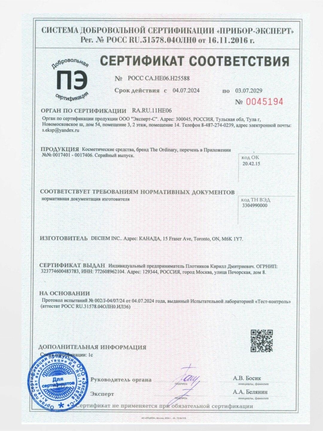 | Дополнительная информация | pH от 5.5 до 6.5; стоит избегать одновременного применения сыворотки с кислотами и щелочью из-за возможного жжения |