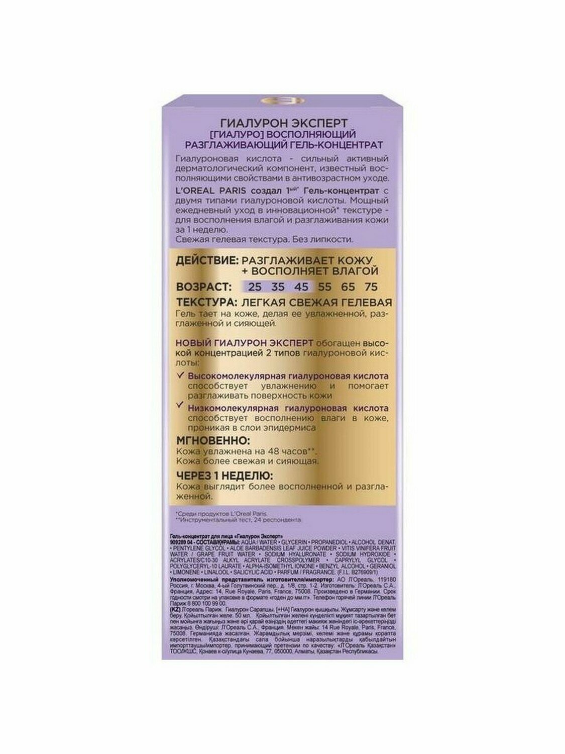 | Дополнительная информация | высокомолекулярная гиалуроновая кислота способствует увлажнению и помогает разглаживать поверхность кожи, низкомолекулярная гиалуроновая кислота способствует восполнению влаги в коже, проникая в слои эпидермиса |