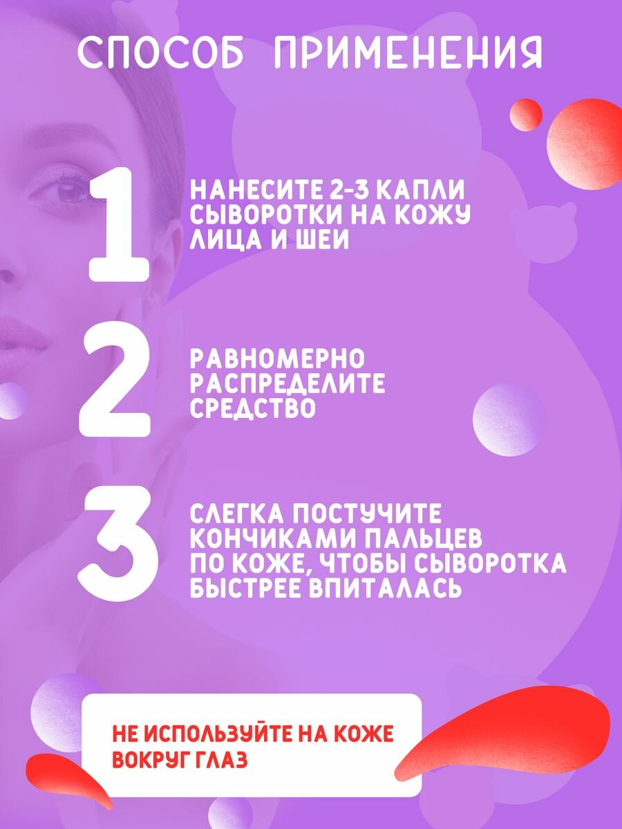 | Способ применения | нанесите несколько капель средства на очищенную и тонизированную кожу. Равномерно распределите жидкость и вотрите мягкими движениями. Сыворотку можно использовать как самостоятельное средство, а можно добавлять в разные косметические продукты |