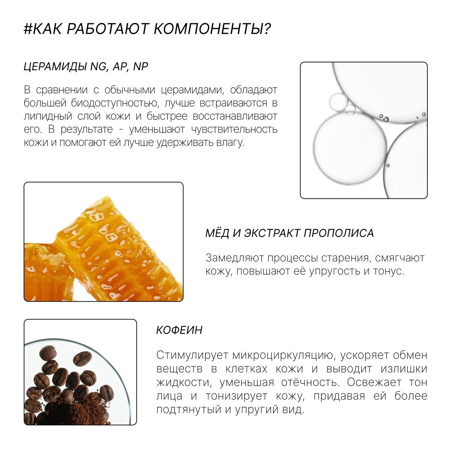 | Активный ингредиент | азелаиновая кислота / аллантоин / аминокислоты / бетаин / витамин A (ретинол) / витамин B3 (ниацинамид) / гиалуроновая кислота / глицерин / глюконолактон / коллаген / кофеин / лецитин / мед / пантенол (провитамин B5) / пептиды / ресвератрол / салициловая кислота / сок алоэ / сок огуречный / уголь / церамиды / цинк / эластин |