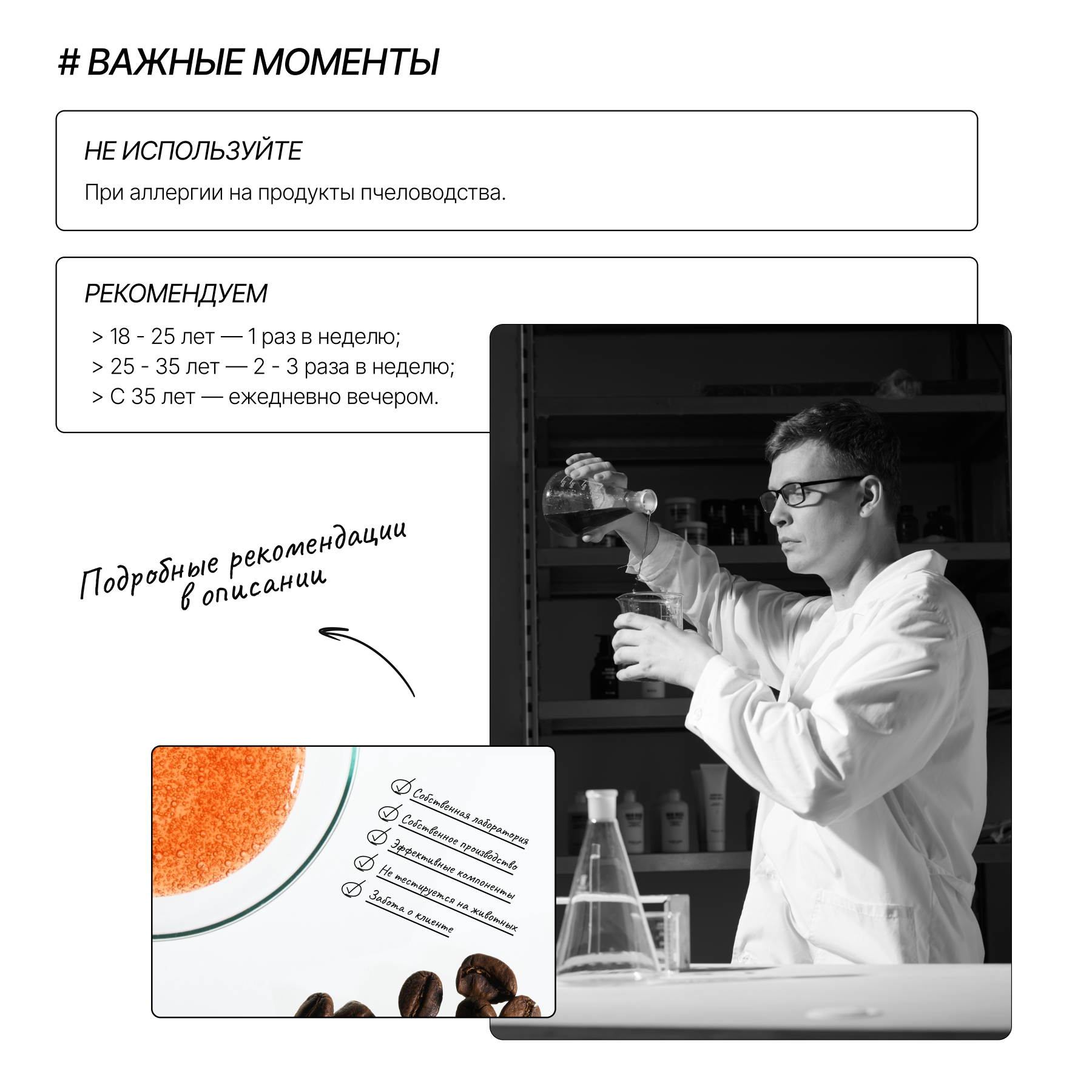 | Способ применения | Применение: нанеси маску на очищенную и тонизированную кожу лица, включая области вокруг глаз, шеи и зону декольте на 10-15 минут. Удали излишки маски влажными ватными дисками. Для более интенсивного воздействия можно оставлять на коже на всю ночь. Подходит любому типу кожи для экспресс-ухода и применения курсом. Частота использования: 18-25 лет — 1 раз в неделю (нанести перед сном на 15-20 минут, а затем смыть); 25-35 лет — 2-3 раза в неделю (можно оставлять на всю ночь). с 35 лет — вечерний уход на ежедневной основе (можно оставлять на всю ночь). |
