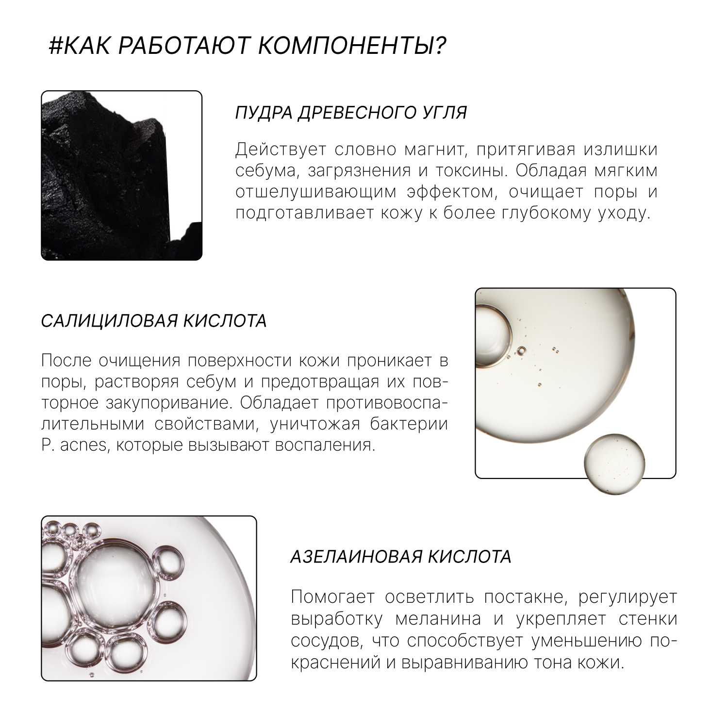| Активный ингредиент | азелаиновая кислота / аллантоин / аминокислоты / бетаин / витамин A (ретинол) / витамин B3 (ниацинамид) / гиалуроновая кислота / глицерин / глюконолактон / коллаген / кофеин / лецитин / мед / пантенол (провитамин B5) / пептиды / ресвератрол / салициловая кислота / сок алоэ / сок огуречный / уголь / церамиды / цинк / эластин |