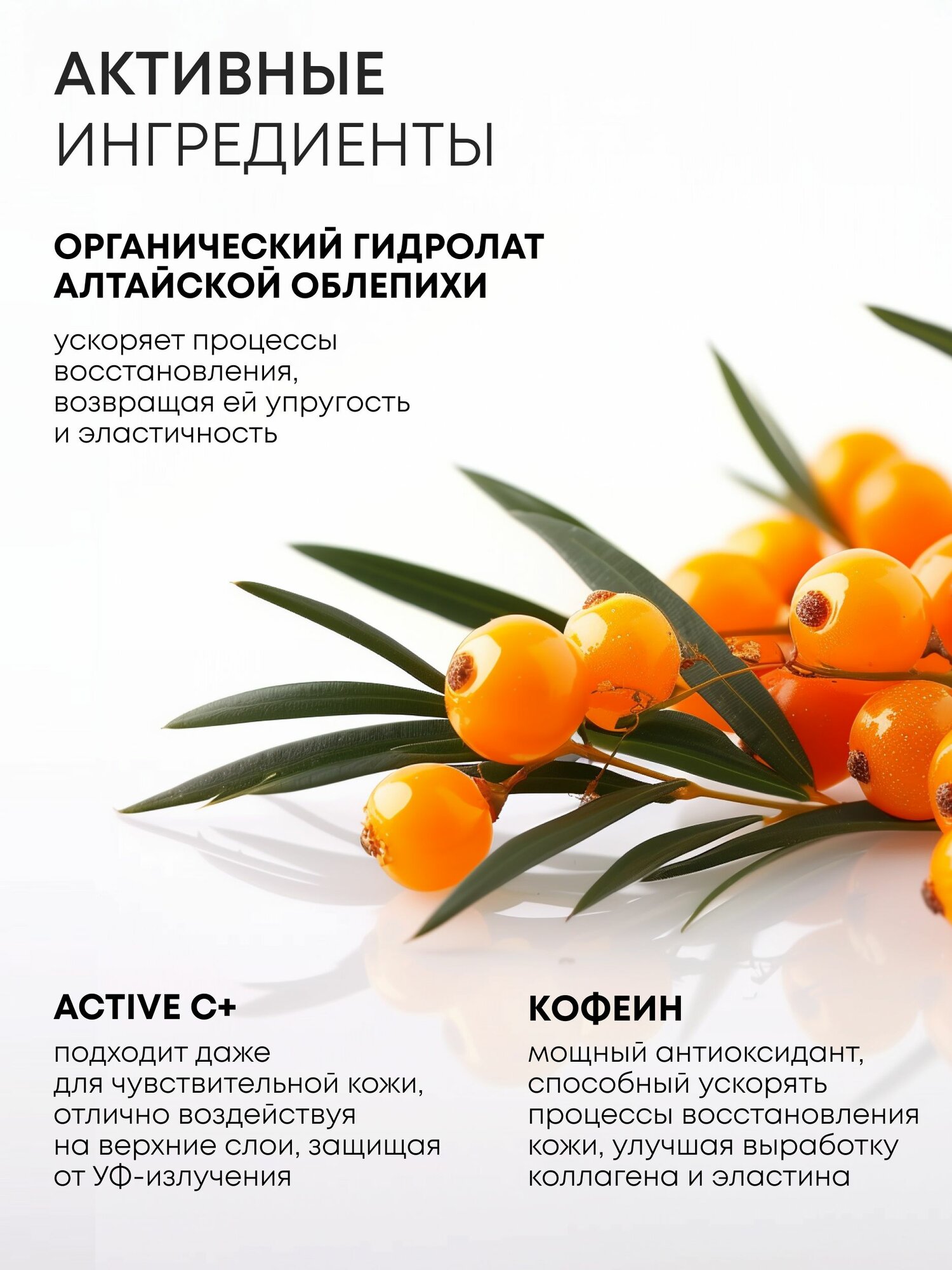 | Активный ингредиент | антиоксиданты / витамин C / витамины / гиалуроновая кислота / коллаген / кофеин / полисахариды / салициловая кислота / эластин |