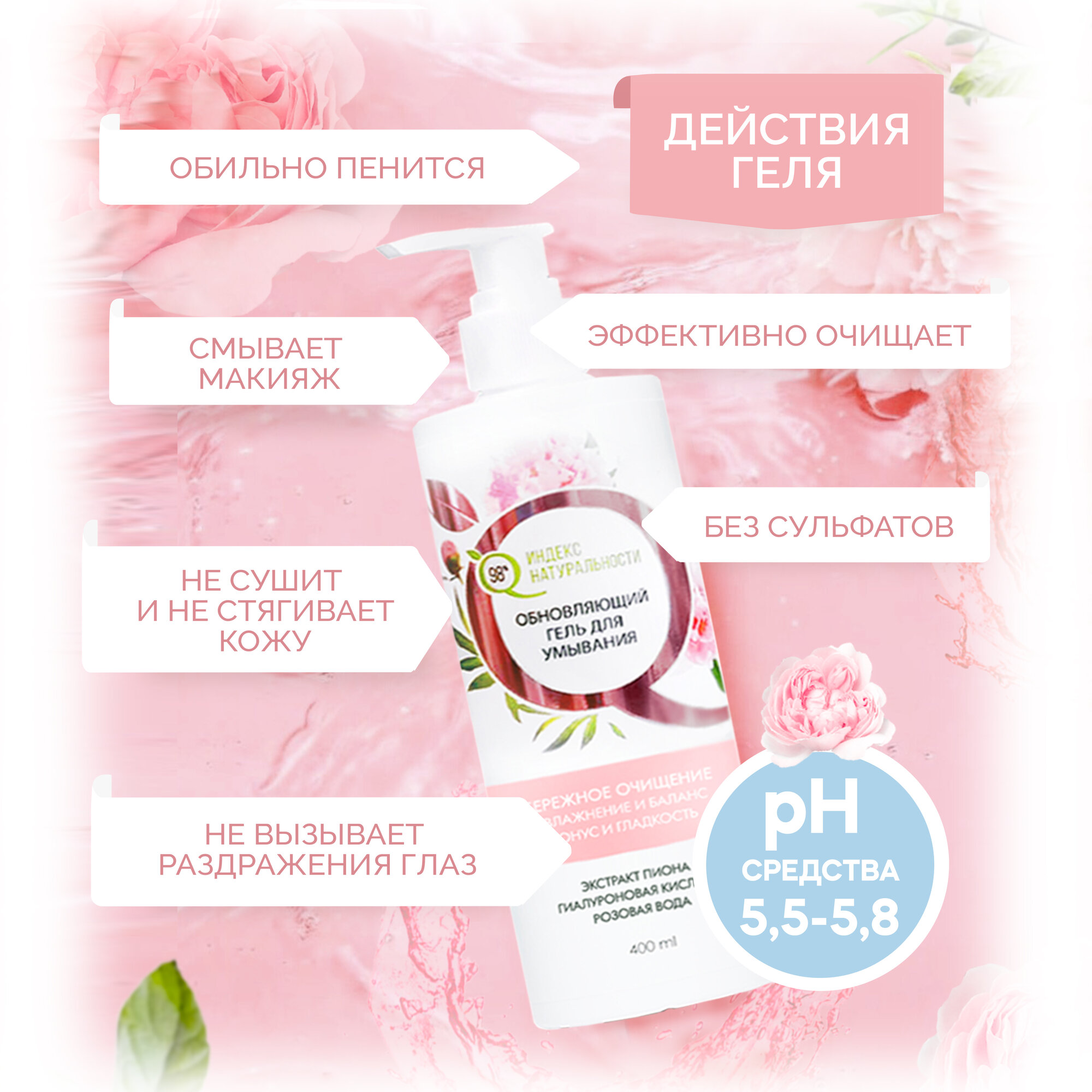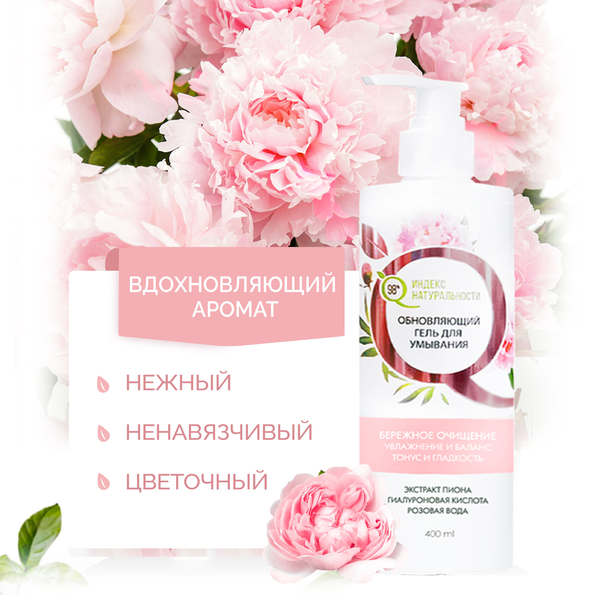 Купить Гель для умывания ИНДЕКС НАТУРАЛЬНОСТИ увлажняющий с гиалуроновой кислотой и экстрактом пиона 400 мл