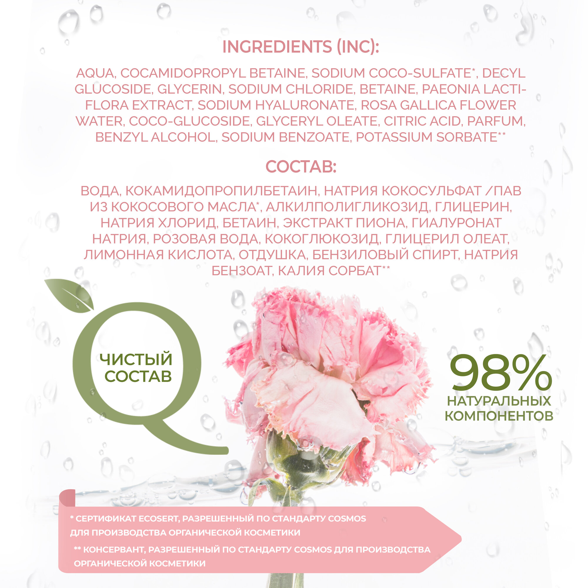 | Не содержит | искусственные консерванты / парабены / пропиленгликоль / силиконы / спирт / сульфаты / формальдегиды |