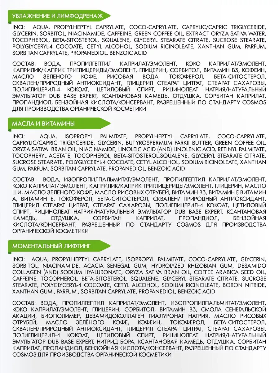 | Масла и экстракты | масло кокоса / экстракт зеленого чая |